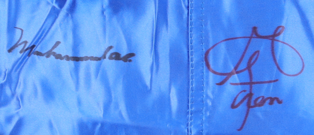 Everlast boxing trunks have been hand-signed by boxing legends, Muhammad Ali (D. 2016, HOF) and George Foreman (HOF). Please note there is stains on the belt of the shorts.