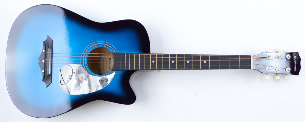 JoyMusic Acoustic guitar measures approximately 38" in length and has been hand-signed on a CD cover that has been repurposed as a pick-guard by Taylor Swift. Please note, the cut is not fully attached to the guitar/pick-guard.