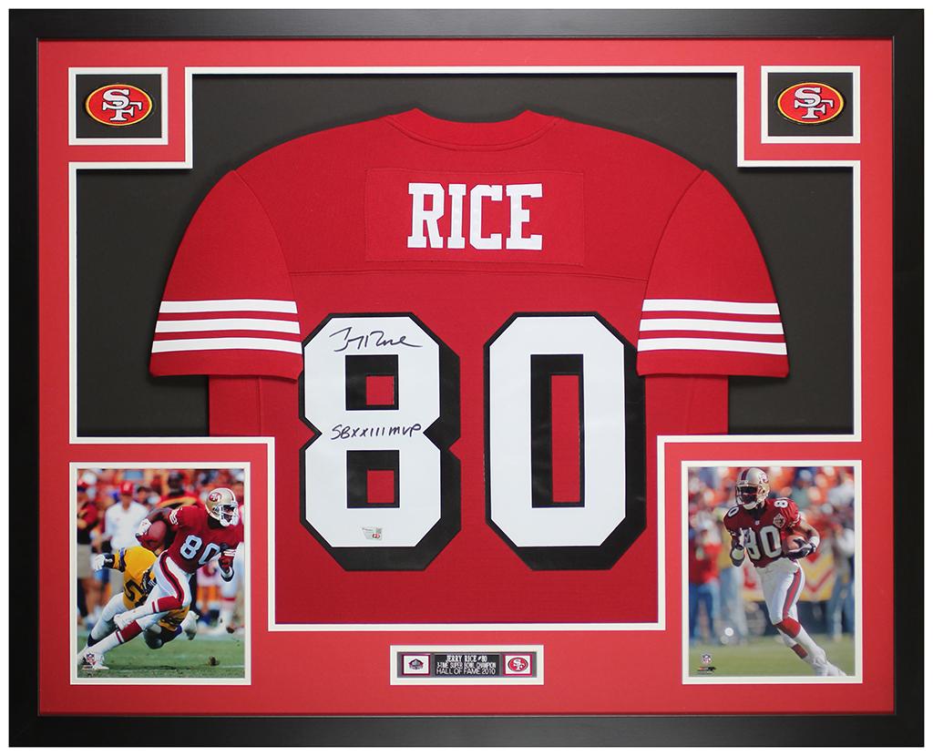 Custom frame measures 35” x 43” in size and features a jersey that has been hand-signed and inscribed by Jerry Rice (HOF).