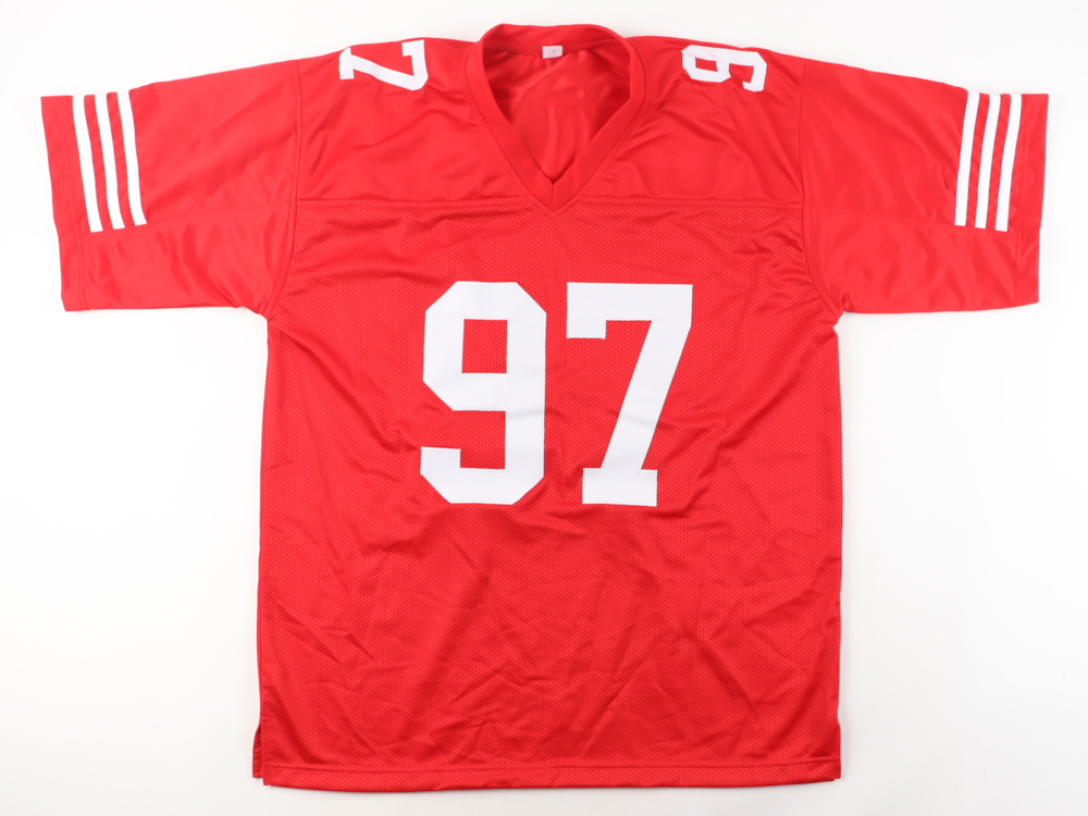 Custom jersey with everything sewn on, size XL. Has been hand-signed by Nick Bosa. Please note, there is a stain on the front number.