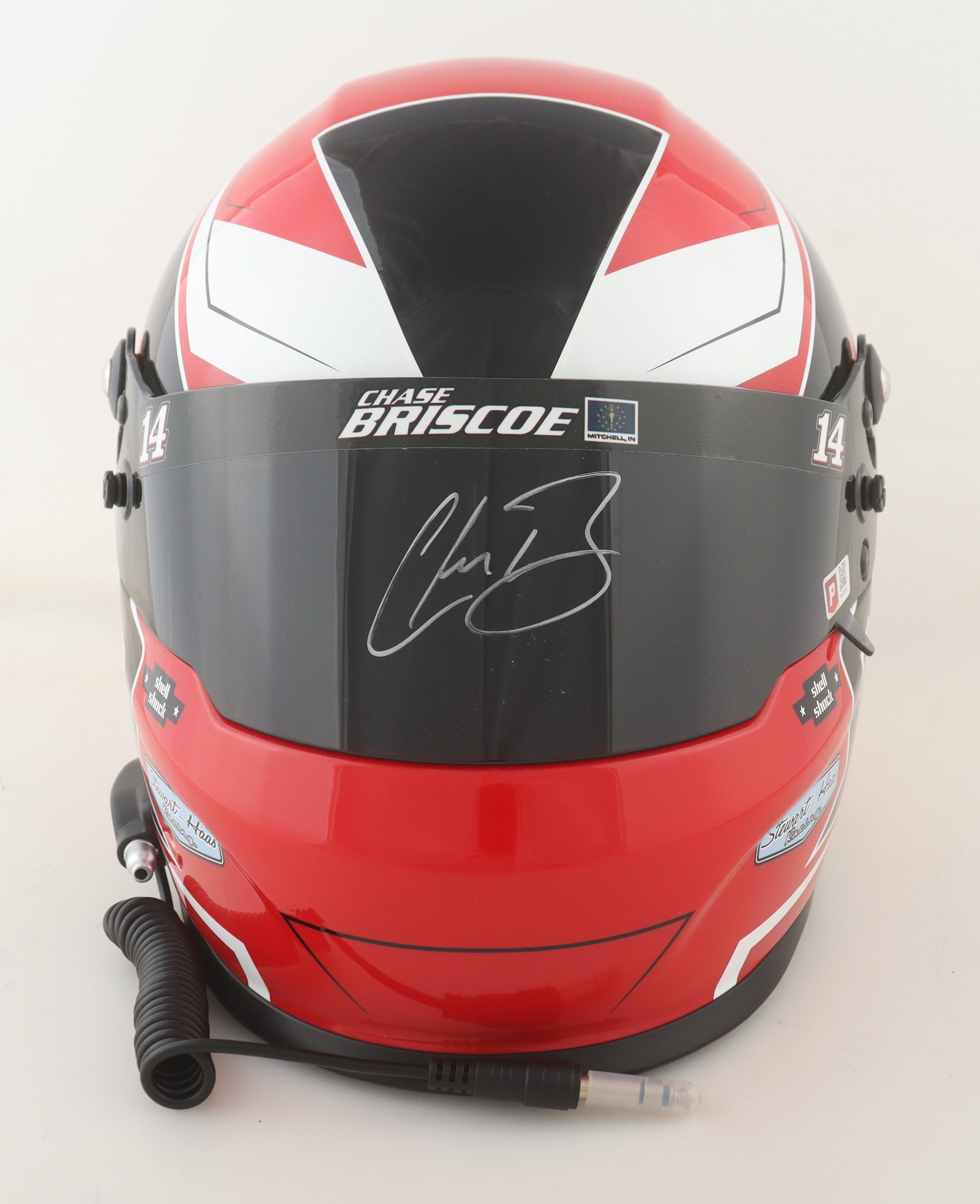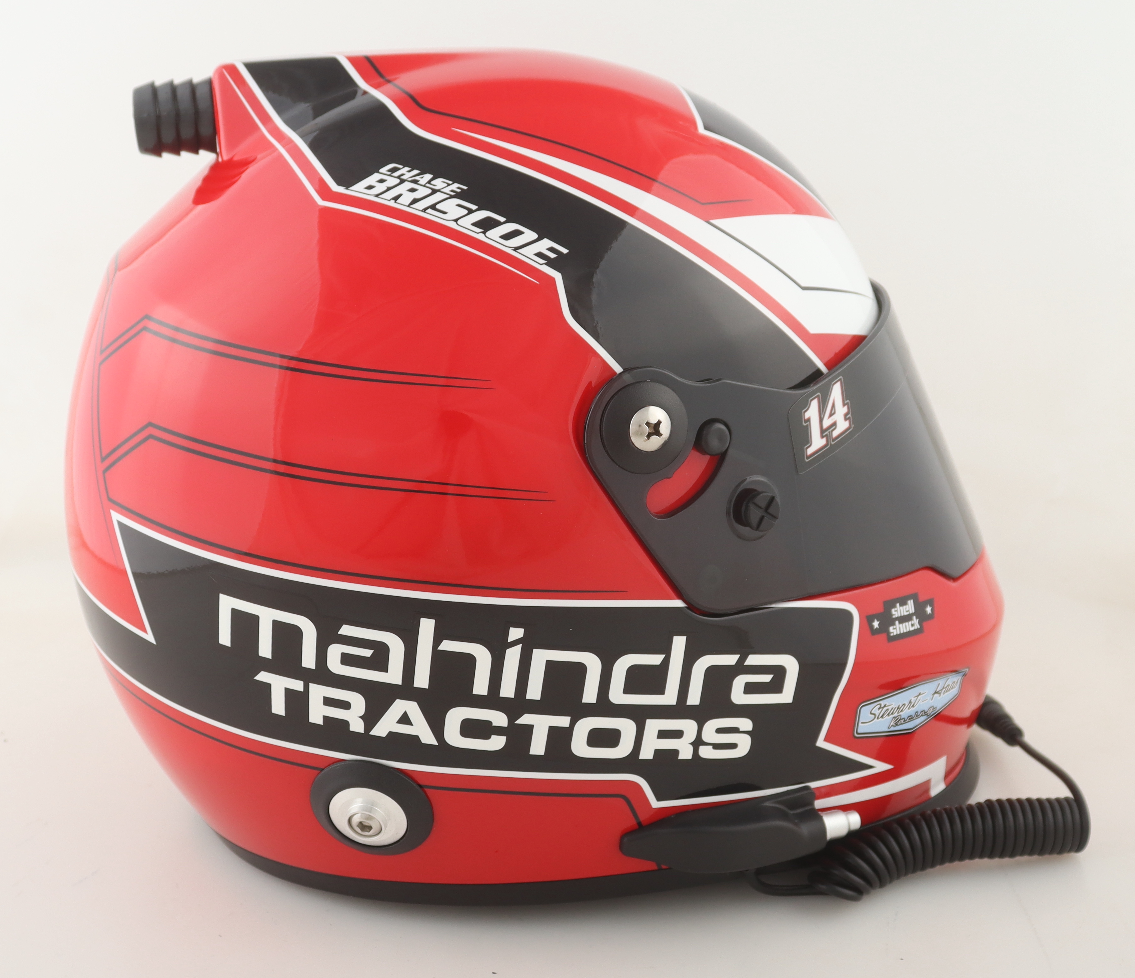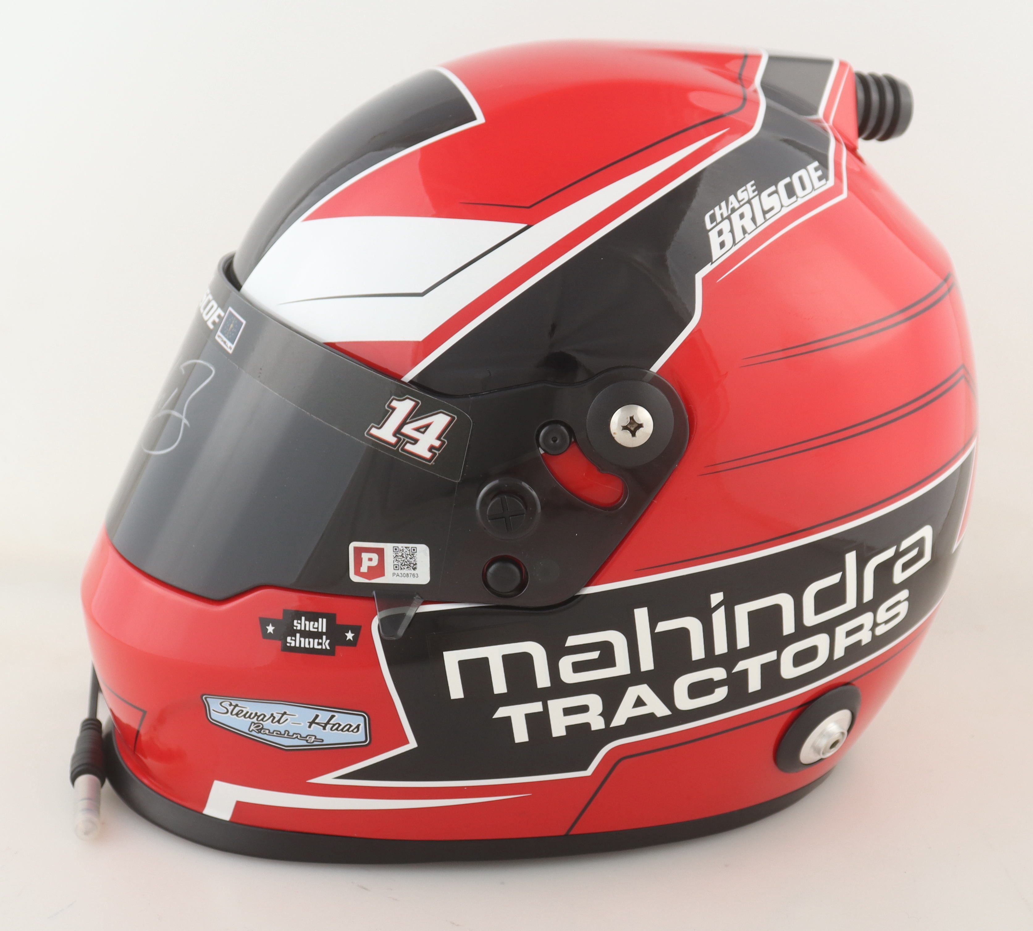 Full-size replica NASCAR Mahindra Tractors helmet has been hand-signed on the visor by Chase Briscoe.