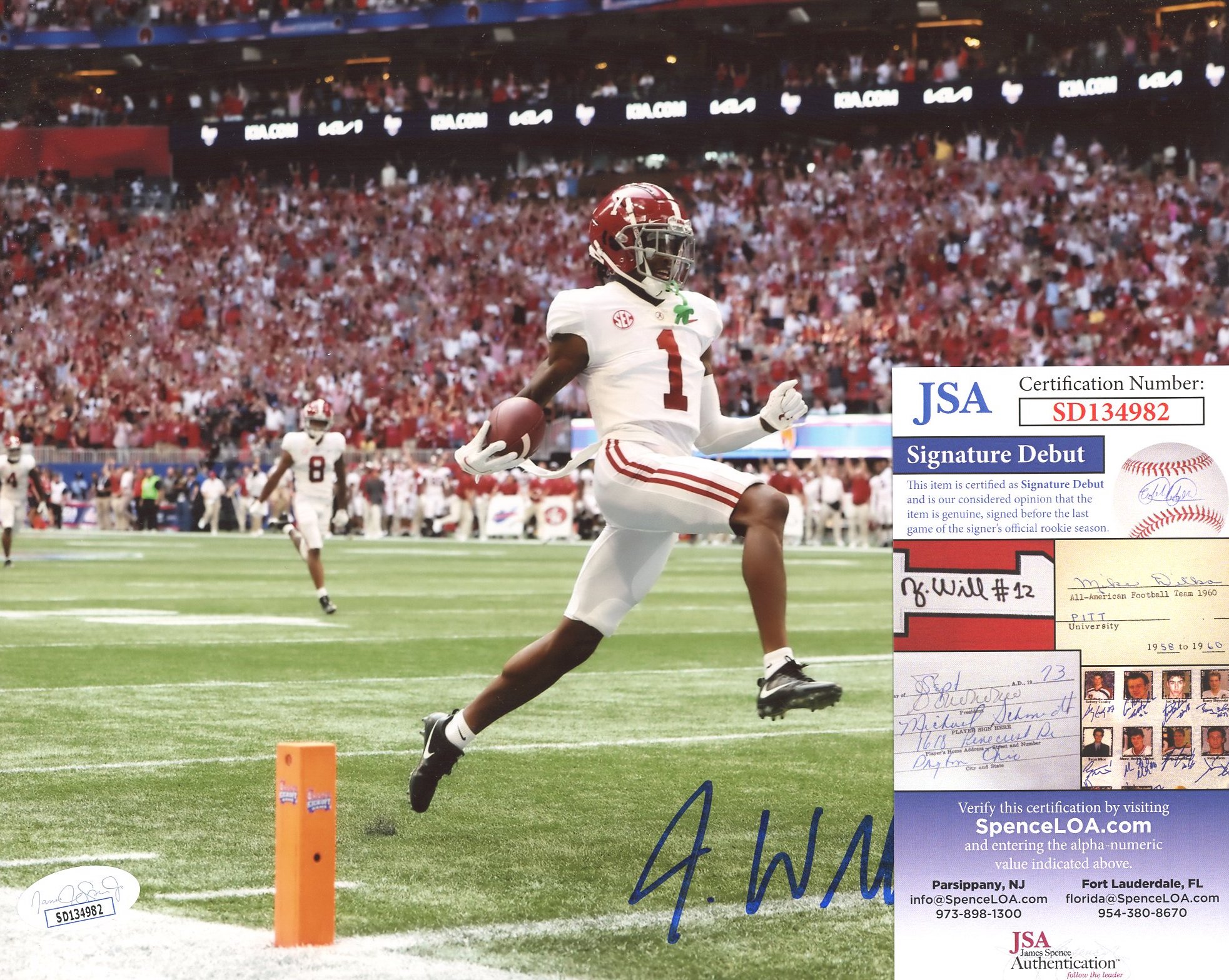 The autograph(s) includes an official James Spence Authentication (JSA) "Signature Debut" hologram and COA. "Signature Debut" is the autographed memorabilia equivalent to a rookie card. The JSA definition of a "Signature Debut" is as follows: "Any item that is autographed and received by JSA prior to the last game of the signer's official rookie season.