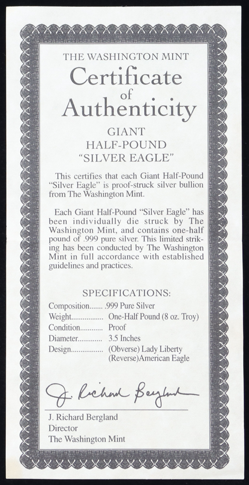 1994 The Washington Mint Giant Half Pound Silver Eagle Proof Silver Coin