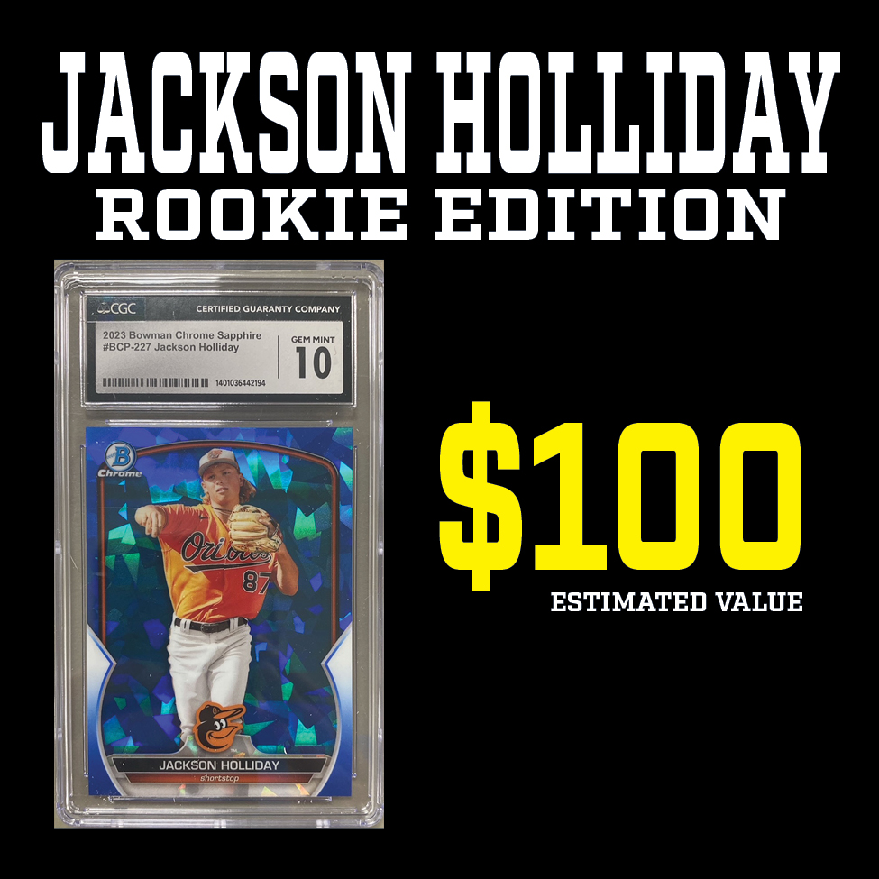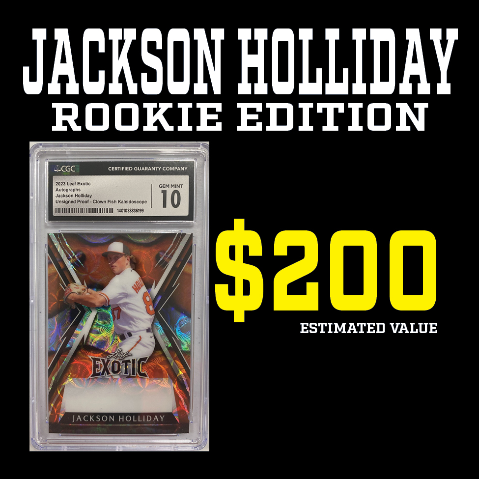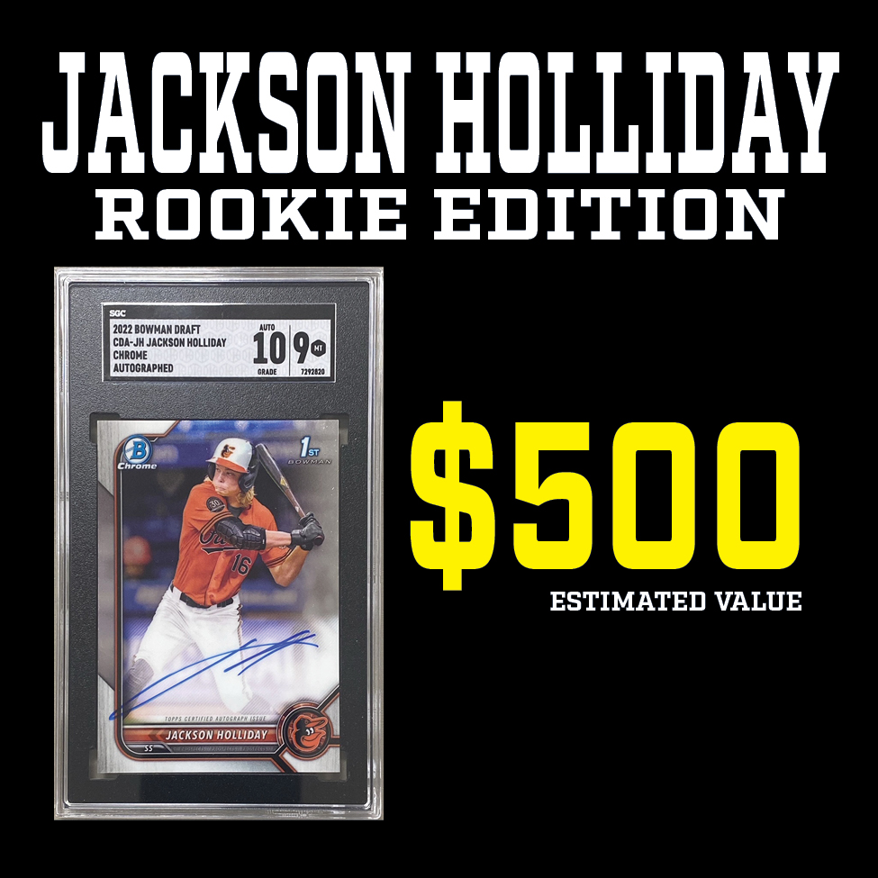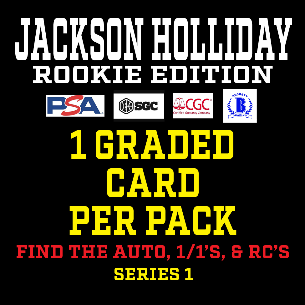 Each "JACKSON HOLLIDAY ROOKIE EDITION” Mystery HIT PACK includes a guaranteed sealed "HIT PACK" which contains a GRADED ROOKIE CARD of JACKSON HOLLIDAY!!!!!!