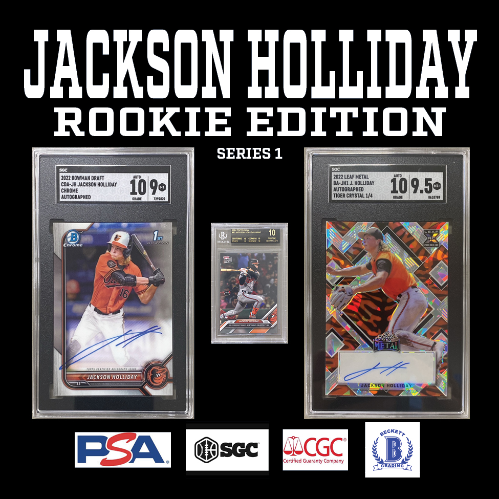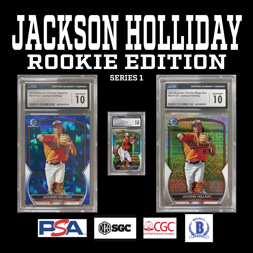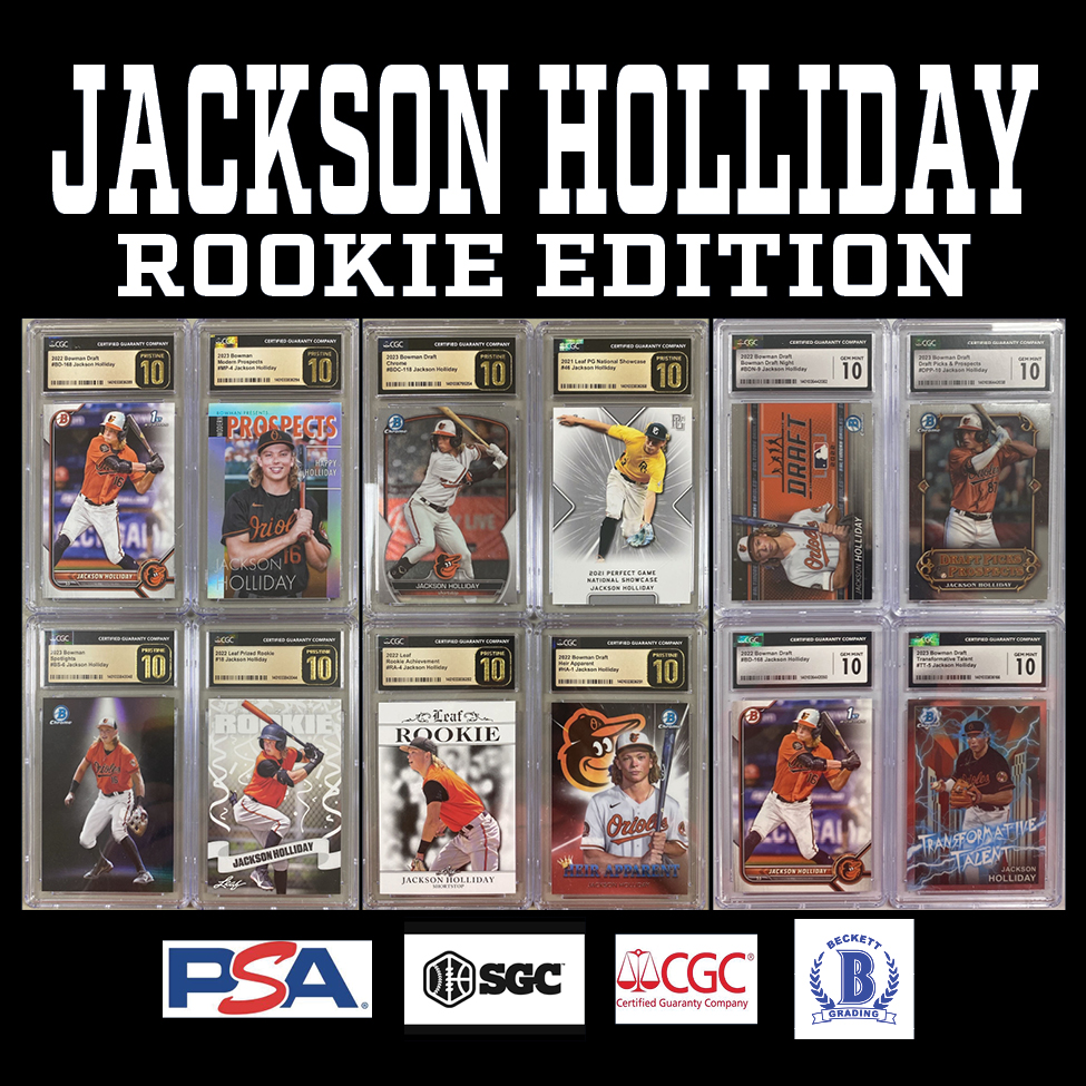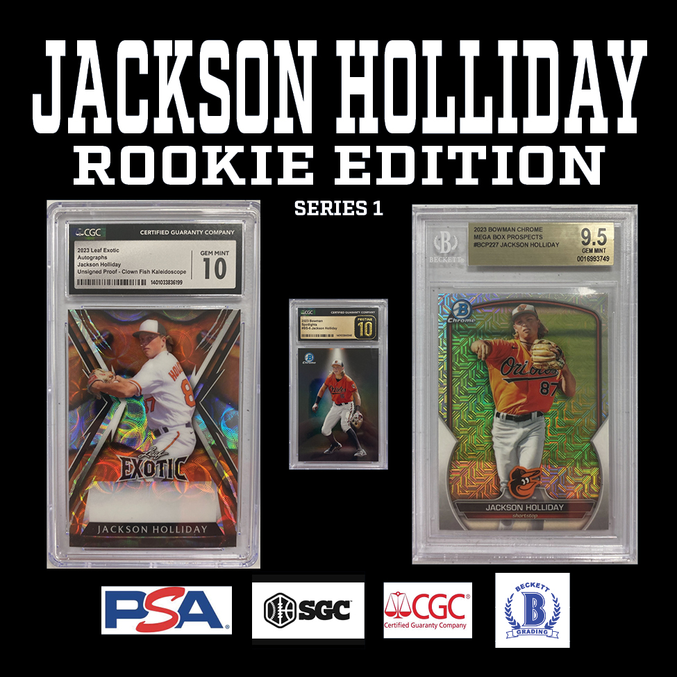 Each "JACKSON HOLLIDAY ROOKIE EDITION” Mystery HIT PACK includes a guaranteed sealed "HIT PACK" which contains a GRADED ROOKIE CARD of JACKSON HOLLIDAY!!!!!!