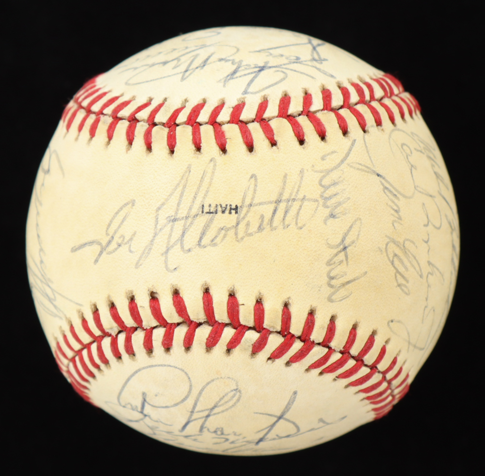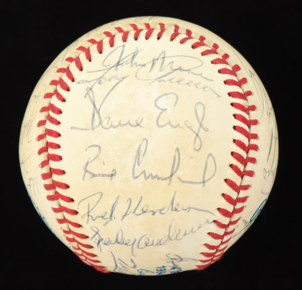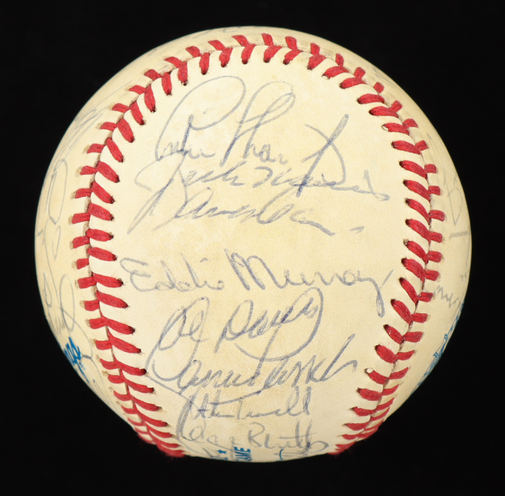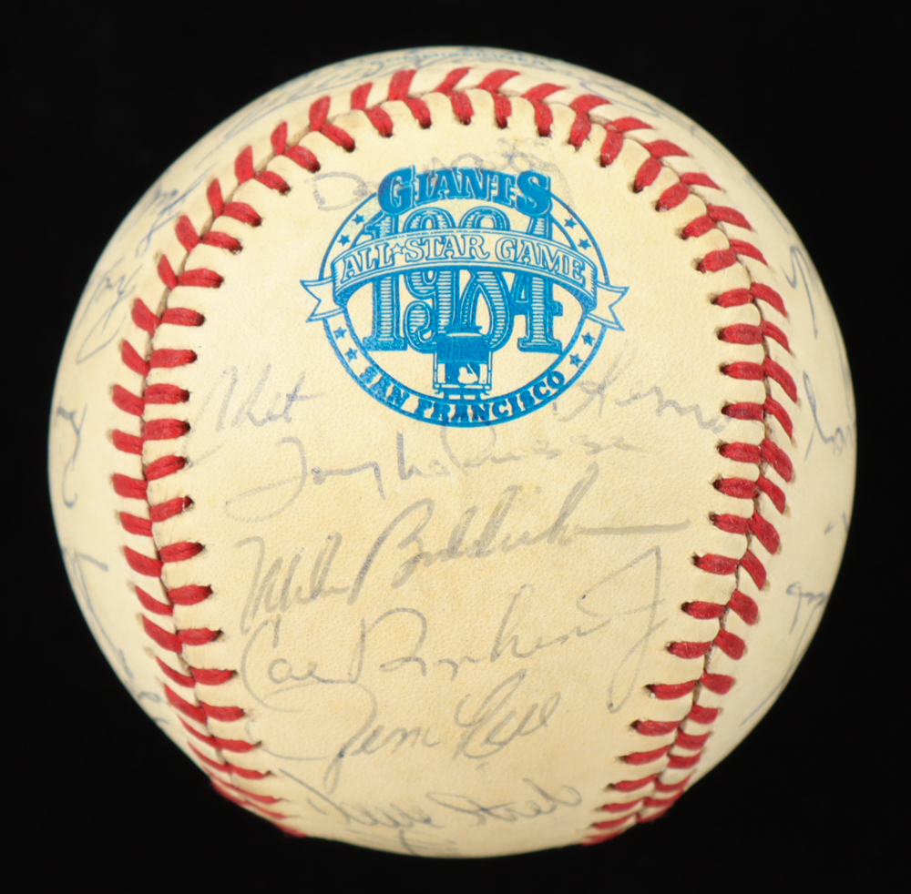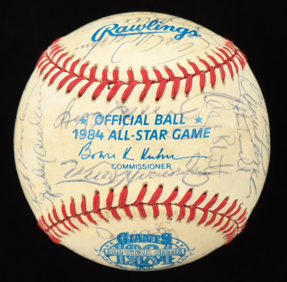 Rawlings 1984 All-Star Game logo baseball. Hand-signed by (30) with Joe Altobelli, Andre Thornton, Jack Morris, Eddie Murray, Alvin Davis, Lance Parrish, Alan Trammell, George Brett, Willie Hernandez, Reggie Jackson, Sparky Anderson, Rickey Henderson, Dave Engle, Tony Armas, Cal Ripken Sr., Phil Niekro, Dave Winfield, Jim Sundberg, Dan Quisenberry, Cal Ripken Jr., Jim Rice, Dave Stieb, Mike Boddicker, Tony LaRussa, Chet Lemon, Don Mattingly and (4) other unknown signers.