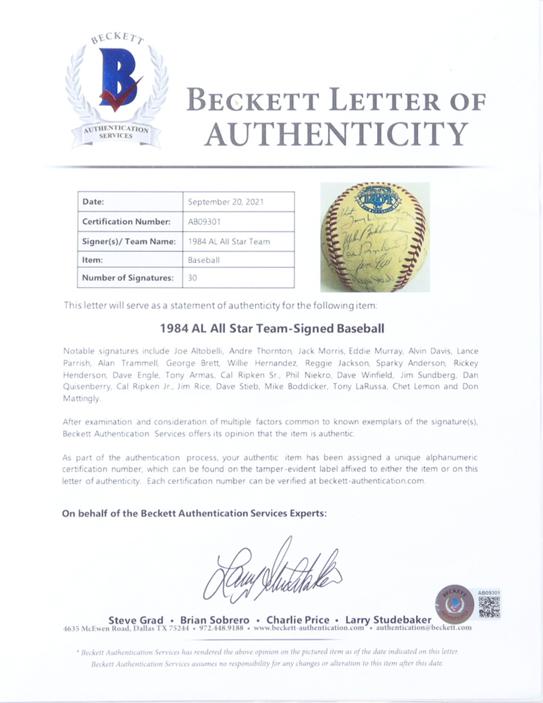1984 AL All-Star Game Baseball Team-Signed by (30) with Cal Ripken Jr., Reggie Jackson, Tony LaRussa, George Brett (Beckett)