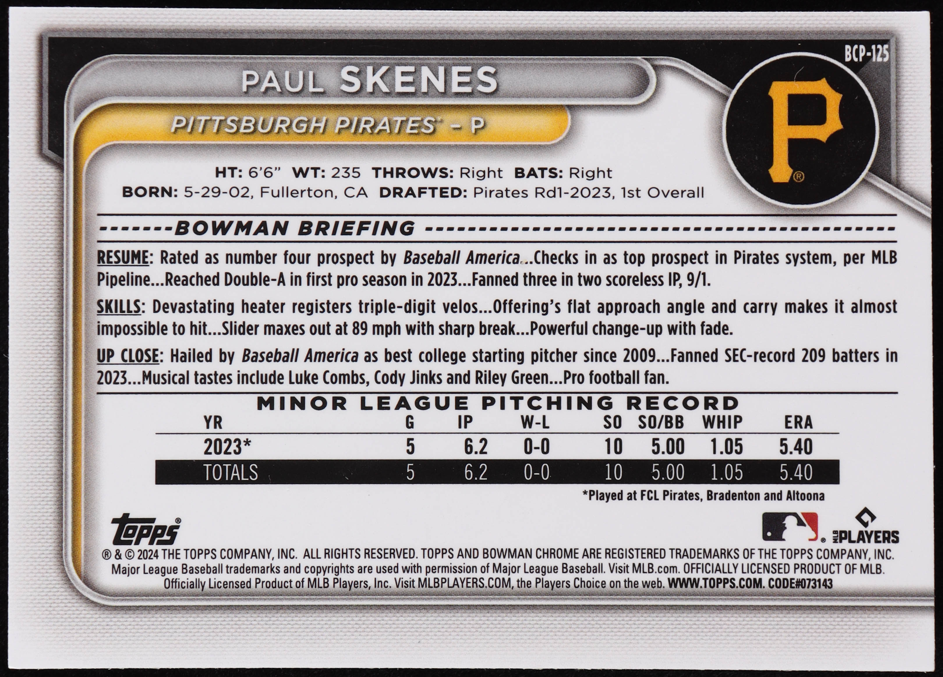 Paul Skenes 2024 Bowman Chrome Prospects #BCP125 RC