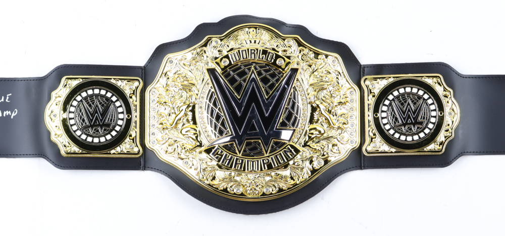 WWE replica plastic toy World Heavyweight Championship belt measures approximately 36" in length. Hand-signed and inscribed by Kurt Angle (HOF).