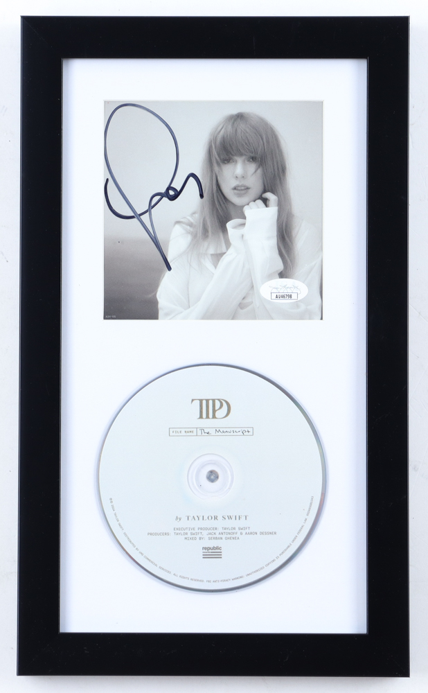 Custom frame measures approximately 8" x 13.5" in size. Features a "The Torture Poets Department" CD insert that has been hand-signed by Taylor Swift. The display also includes the CD as shown. Please note, there is some scuffing on the frame.