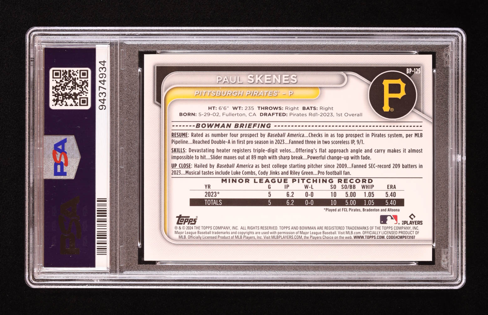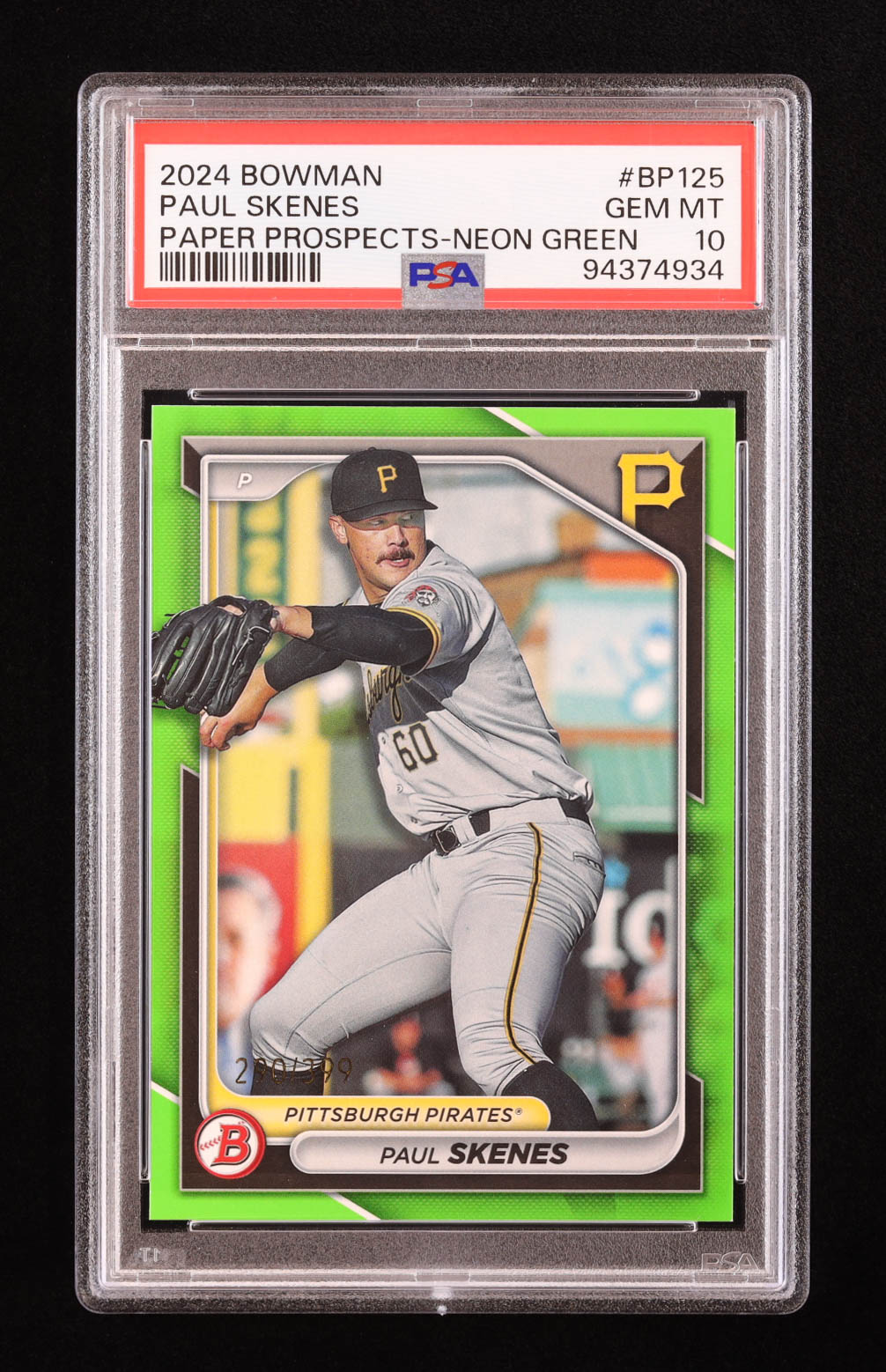 Paul Skenes 2024 Bowman Prospects Neon Green #BP125 #290/399 RC (PSA 10)