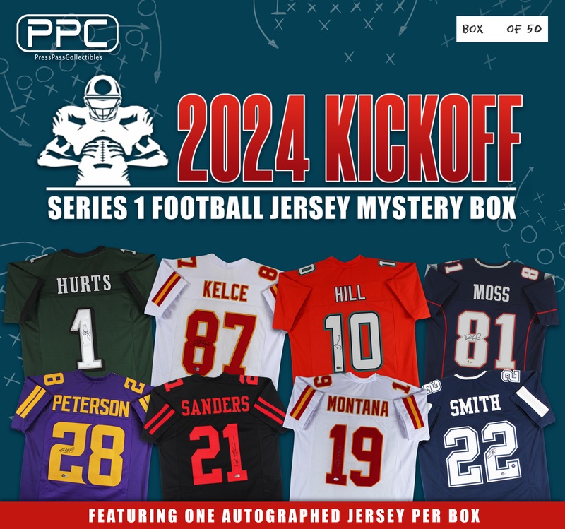The Press Pass Collectibles 2024 kickoff football jersey mystery box includes one (1) custom jersey from your favorite NFL teams. Some boxes will feature jerseys signed by Adrian Peterson, Deion Sanders, Joe Montana, Emmitt Smith, and many more Stars / Hall of Famers!