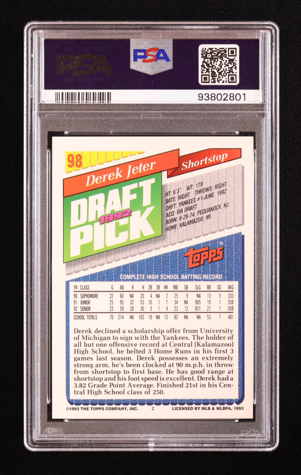Derek Jeter 1993 Topps #98 RC (PSA 9)