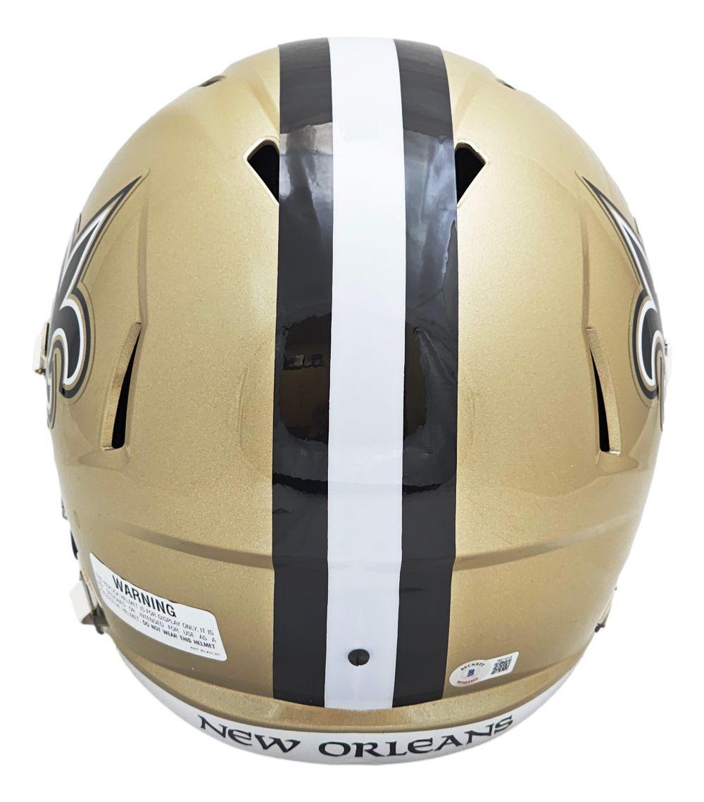 Riddell New Orleans Saints full-size speed replica helmet. Hand-signed and inscribed by Drew Brees.