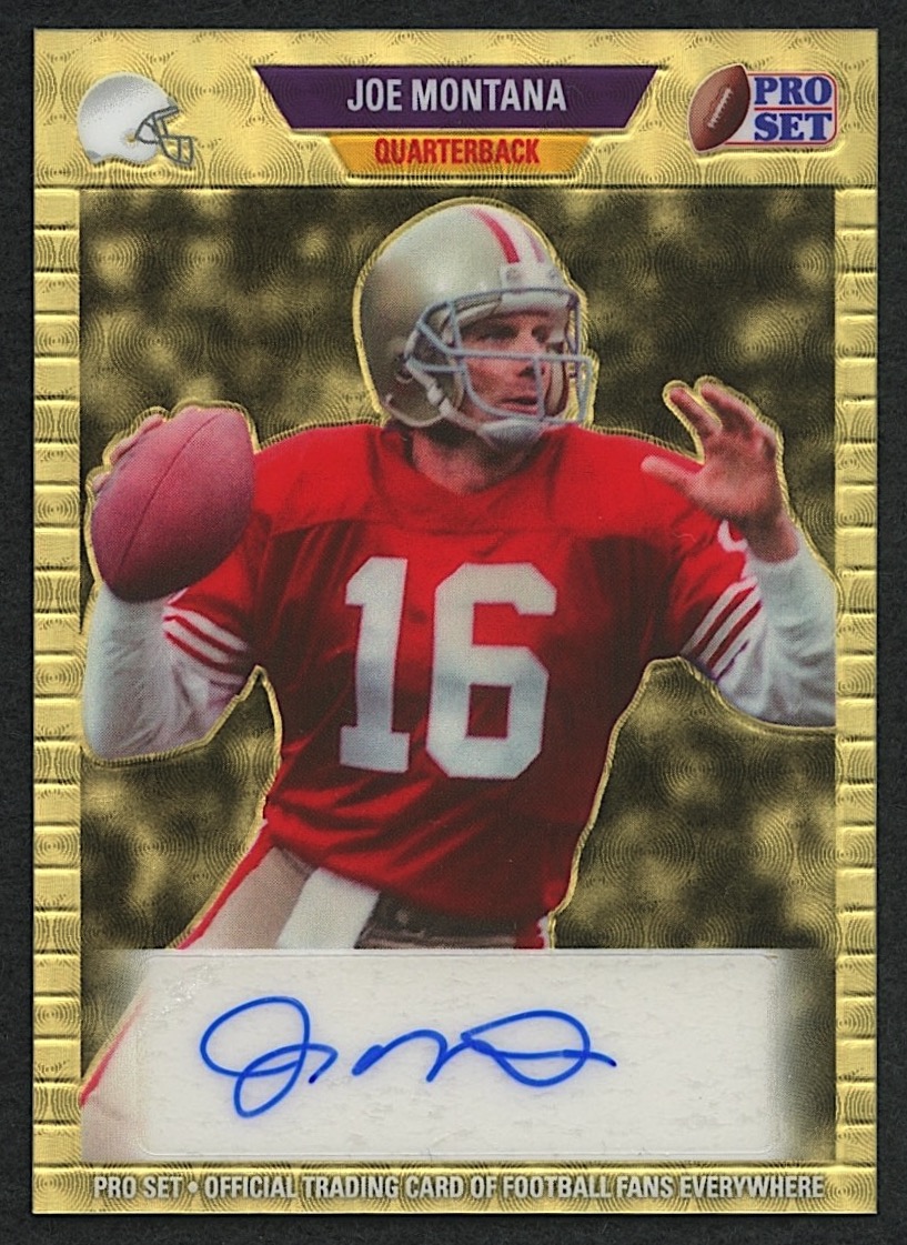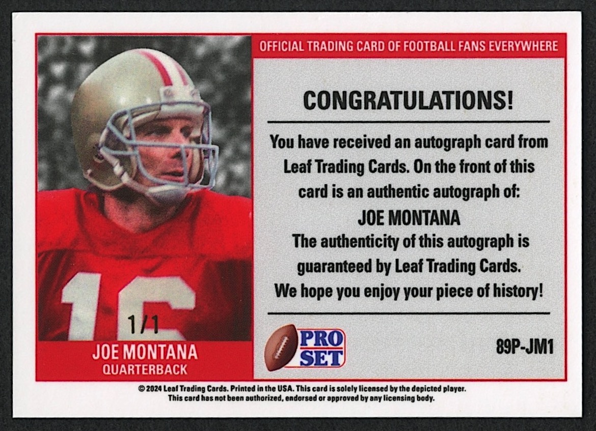 Joe Montana 2024 Leaf Legacy Collection "1989 Pro Set" #89P-JM1 Autograph Gold Vinyl Prismatic #1/1
