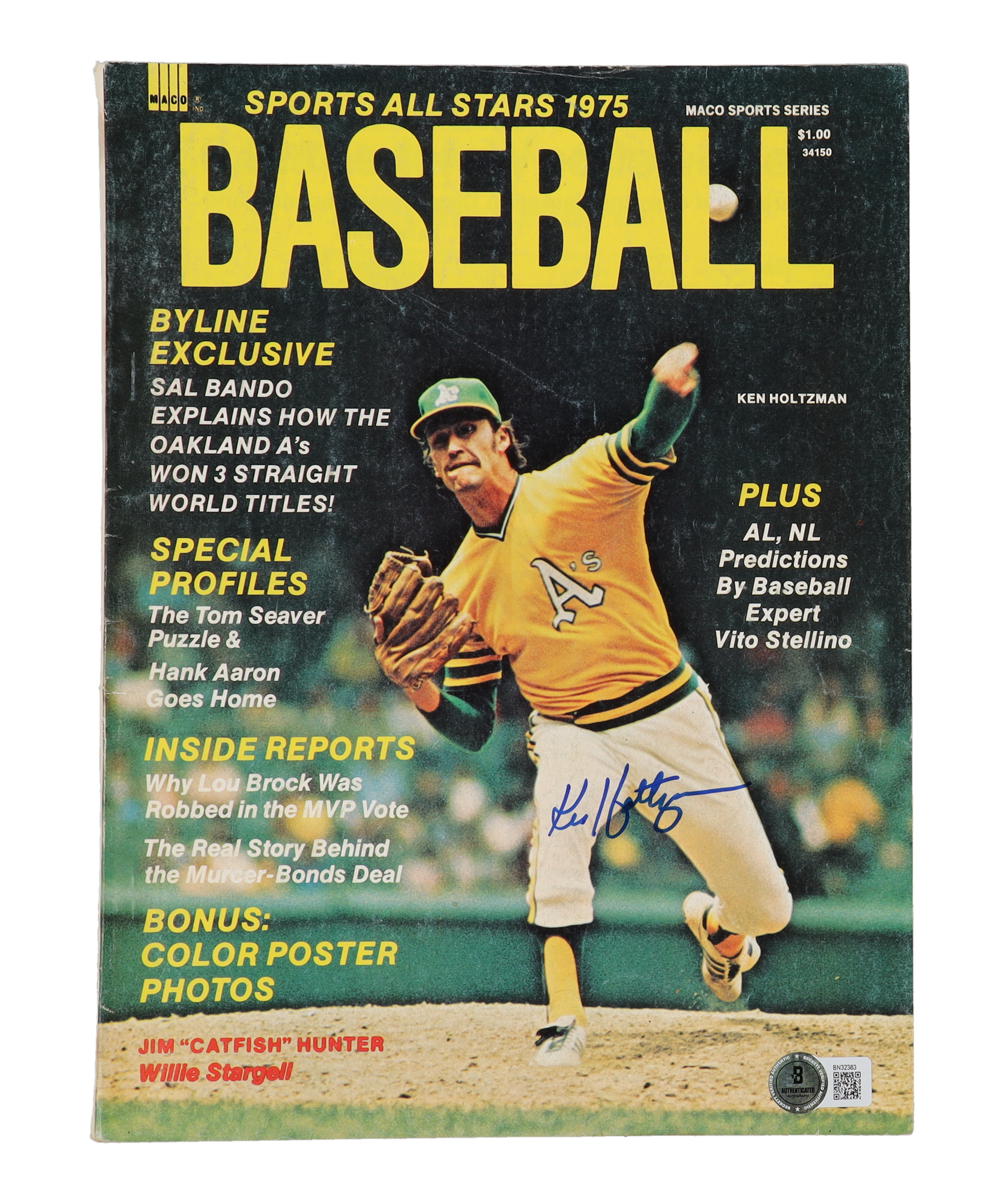 1975 edition magazine has been hand-signed by Ken Holtzman (D. 2024, Oakland Athletics).