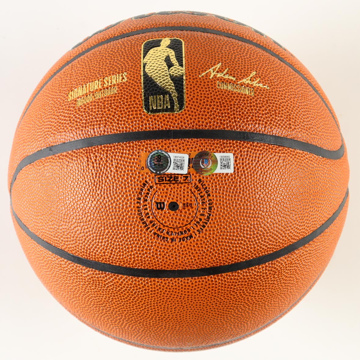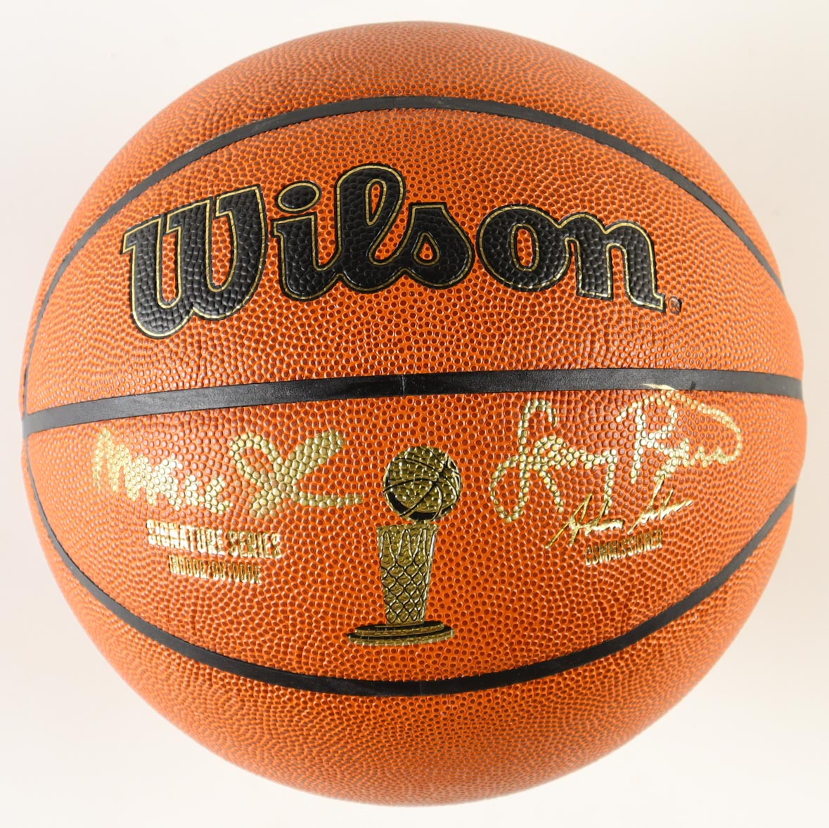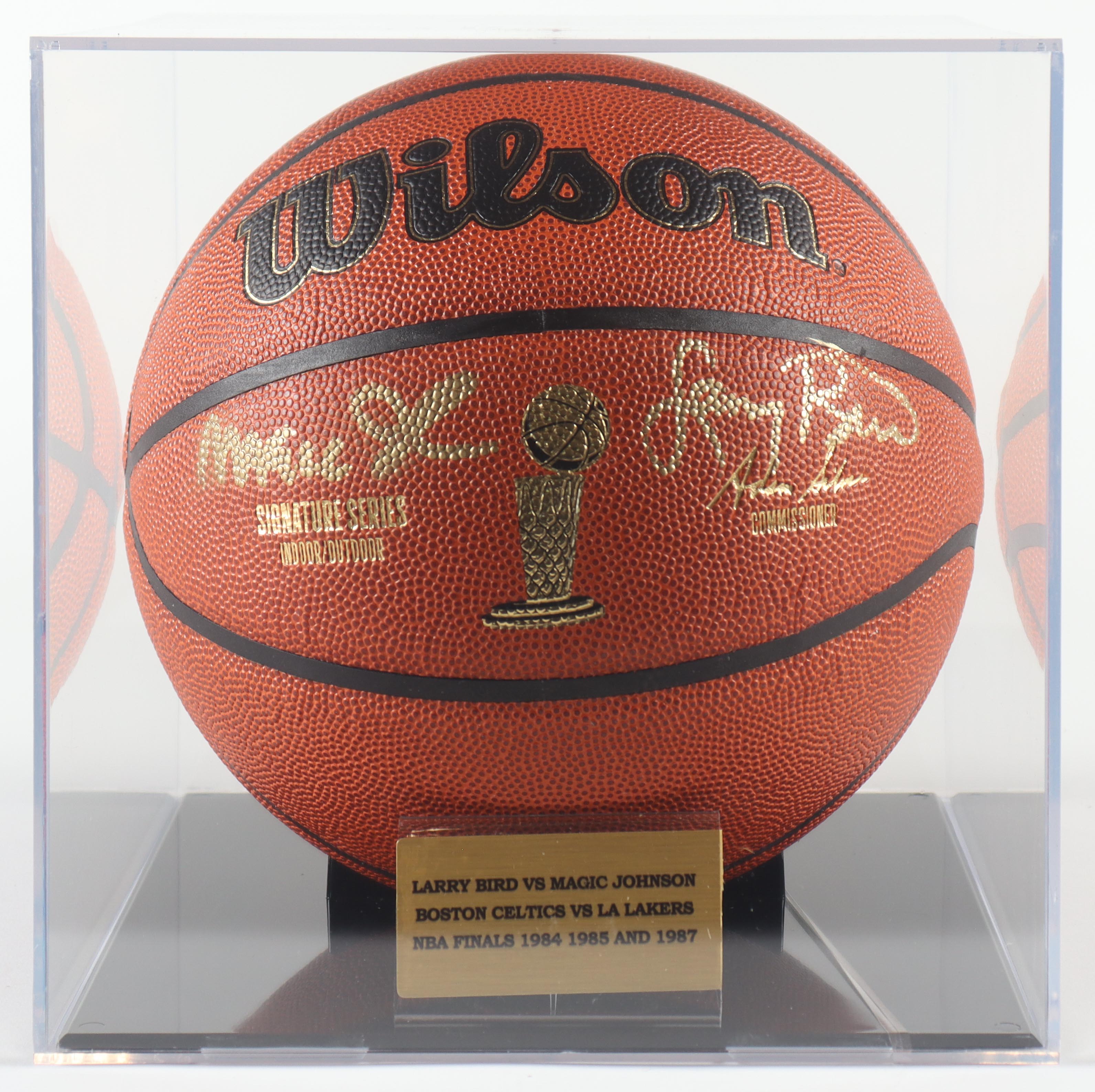 Wilson Signature Series Indoor/Outdoor NBA Finals Trophy Special Edition basketball. Hand-signed by Magic Johnson (Los Angeles Lakers, HOF) and Larry Bird (Boston Celtics, HOF). The display case is included as shown.