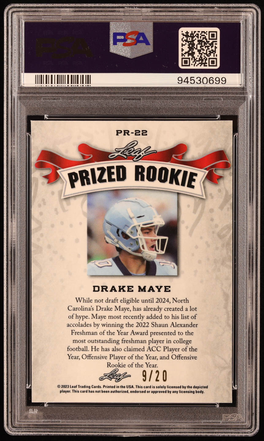 Drake Maye 2023 Leaf Special Release Prized Rookie Mojo Blue #PR22 RC #9/20 (PSA 10)