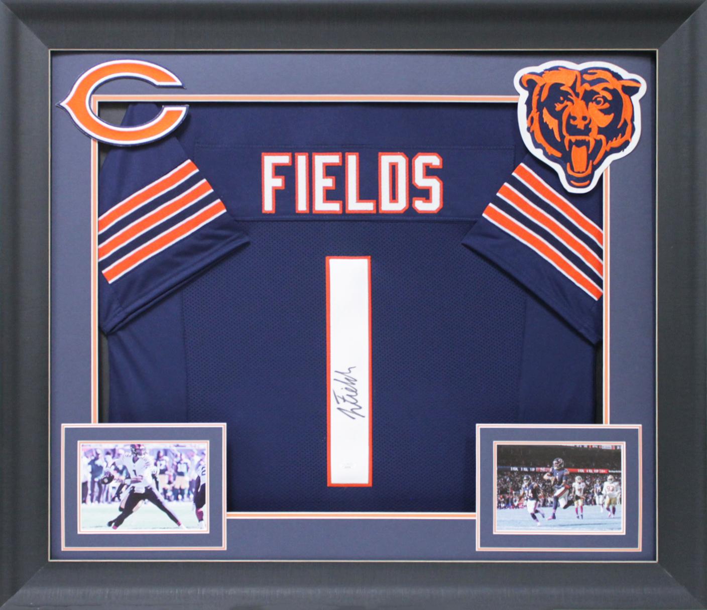 Custom frame measures 32" x 37" in size and features a jersey that has been hand-signed by Justin Fields.