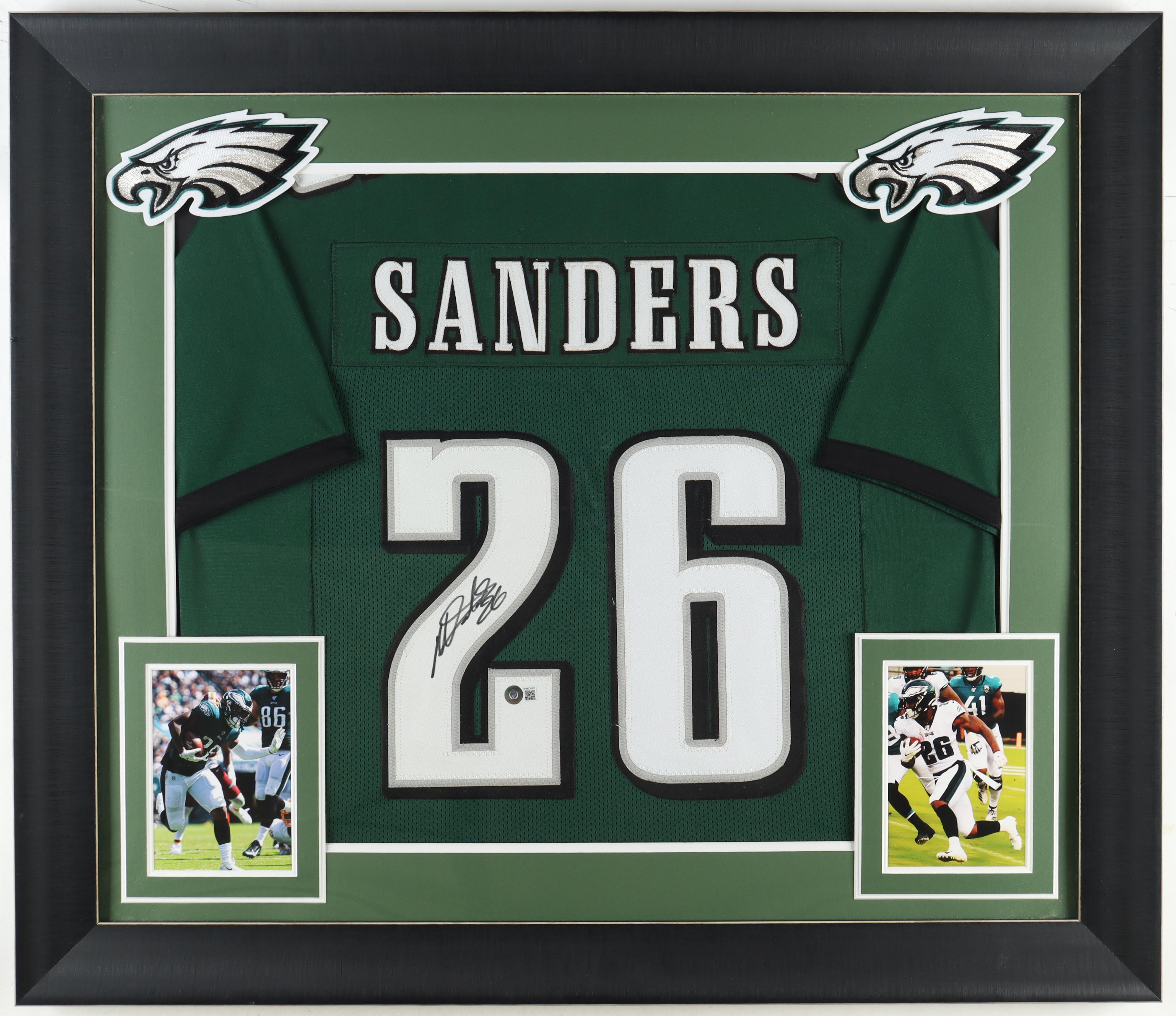 Custom frame measures approximately 32" x 37" in size and features a jersey hand-signed by Miles Sanders.