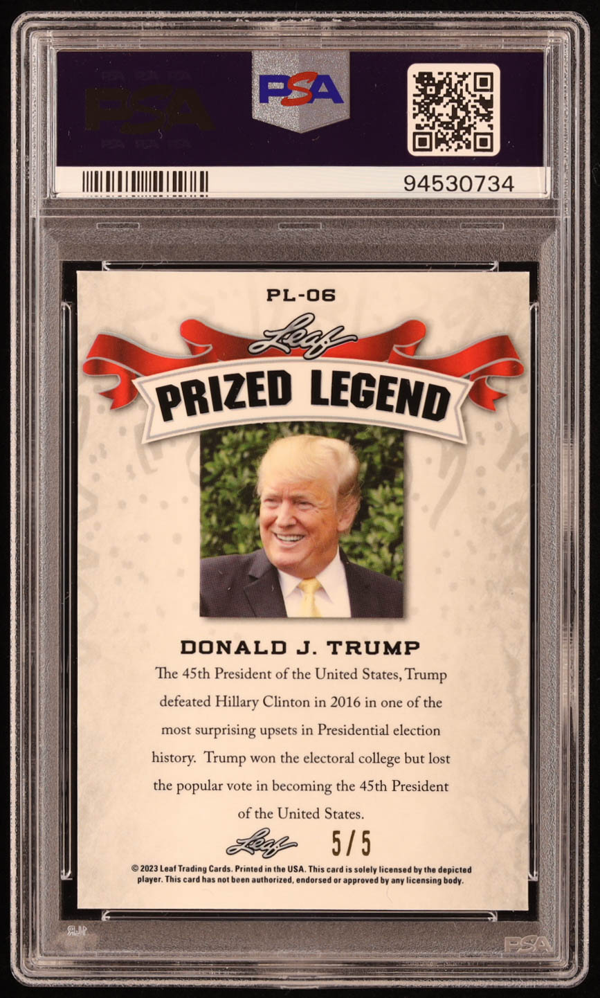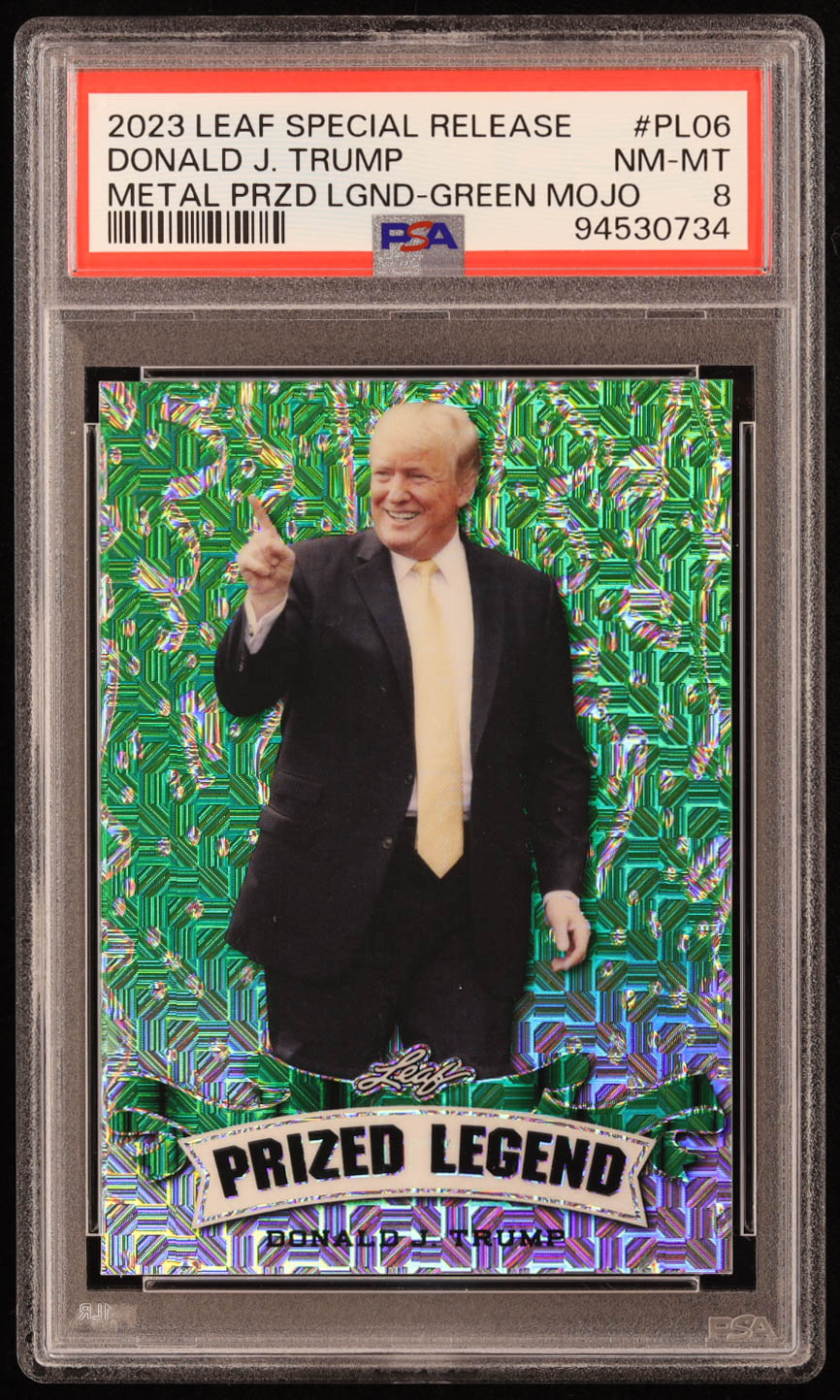 Donald J. Trump 2023 Leaf Metal Special Release Prized Legend Mojo Green #PL06 #5/5 (PSA 8)