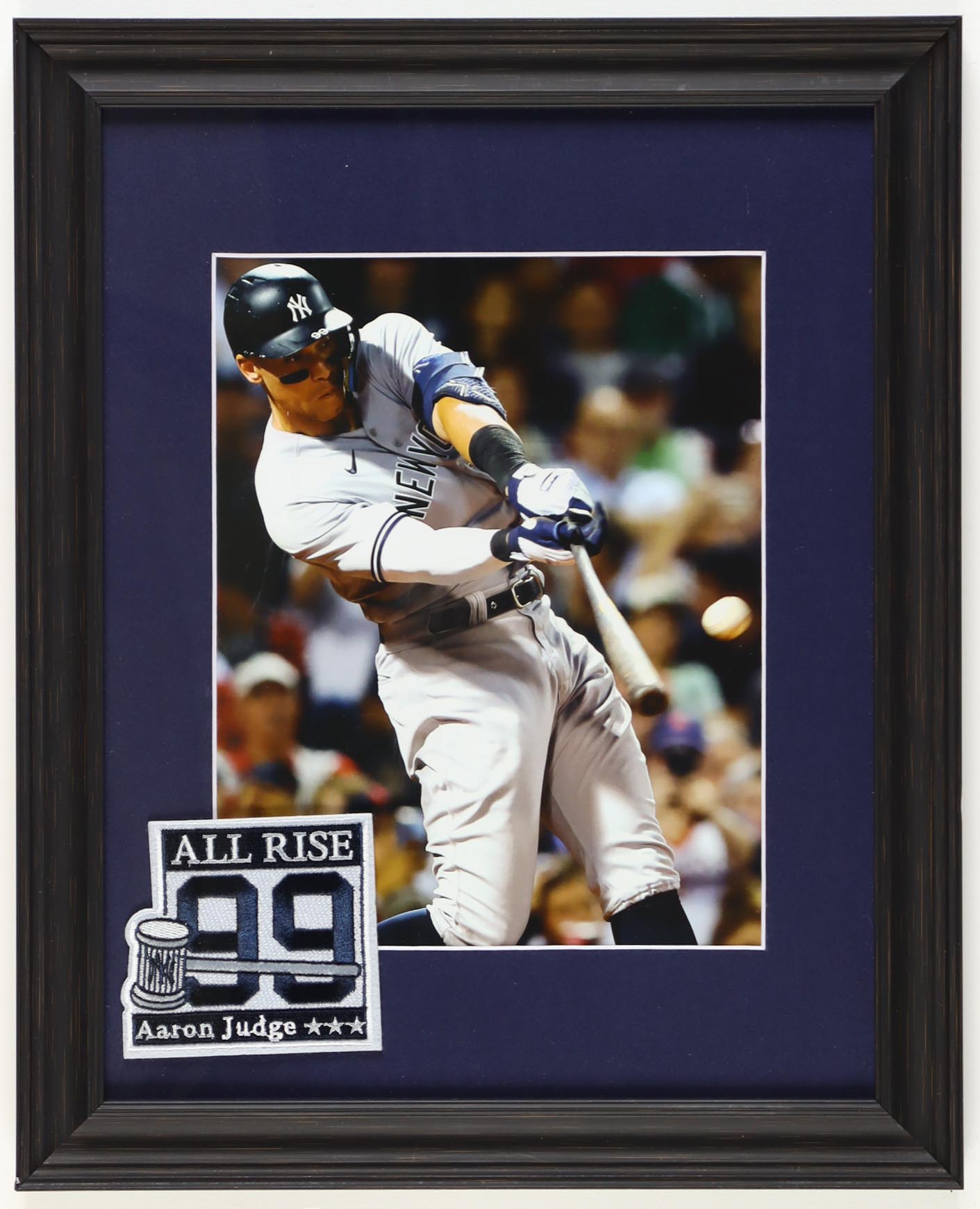Custom frame measures approximately 13.25" x 16.25" in size. Features an unsigned photo that depicts Aaron Judge (New York Yankees) as well as a Yankees #99 Judge patch. Please note, the display is unsigned.