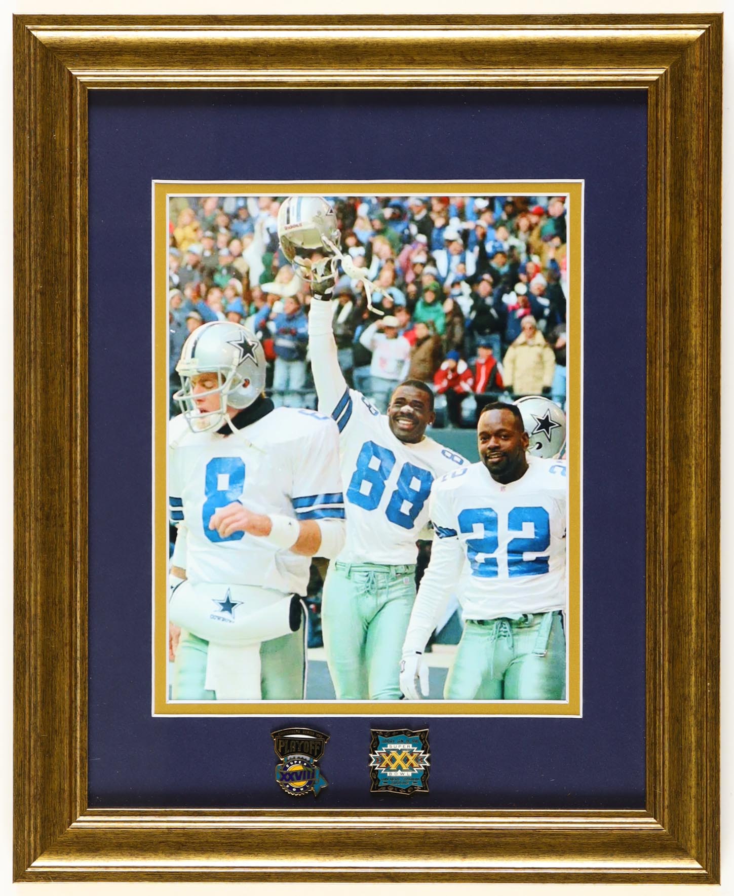 Troy Aikman, Emmitt Smith & Michael Irvin Custom Framed Photo Display with Official Super Bowl XXVIII & XXX Vintage Pin Set