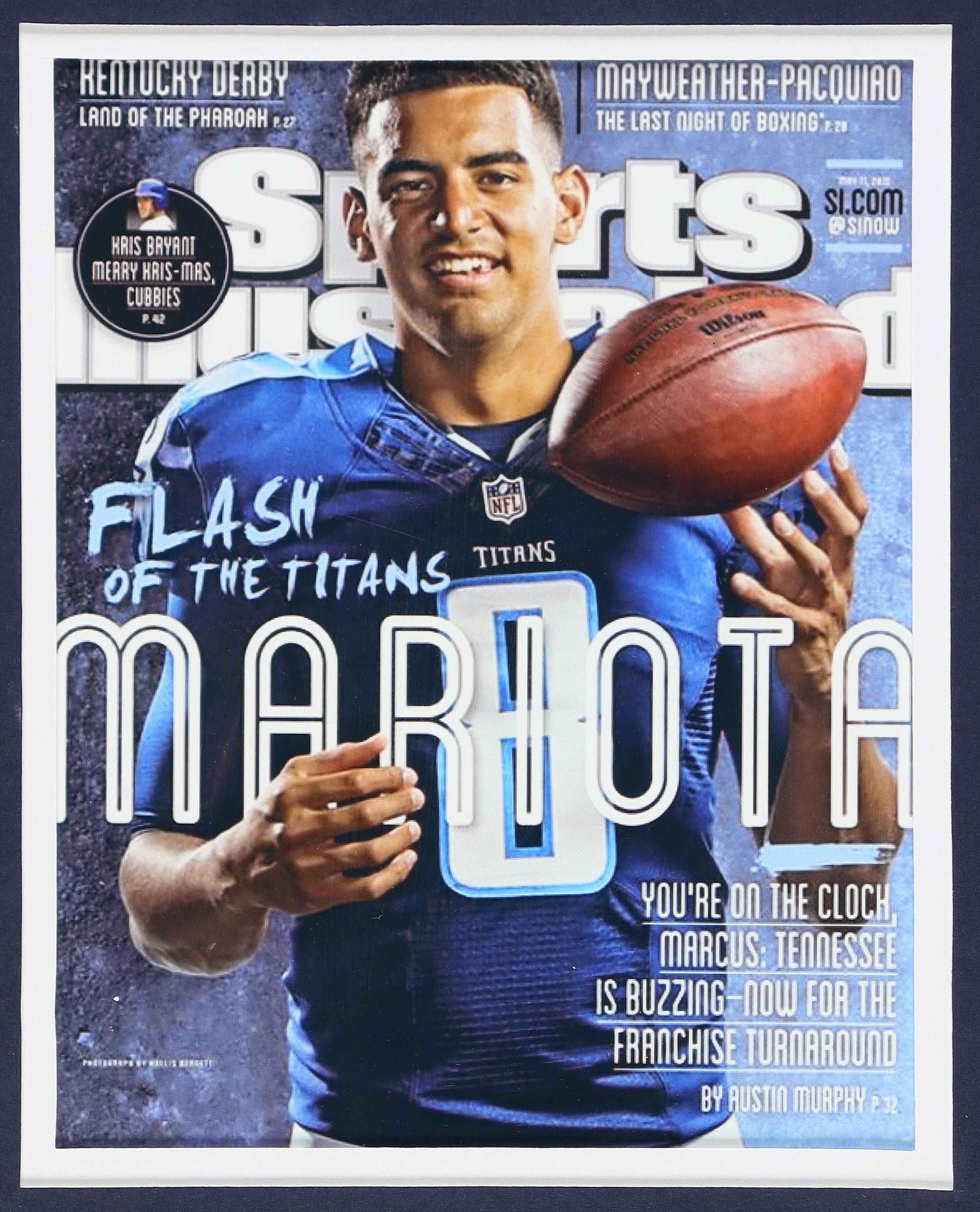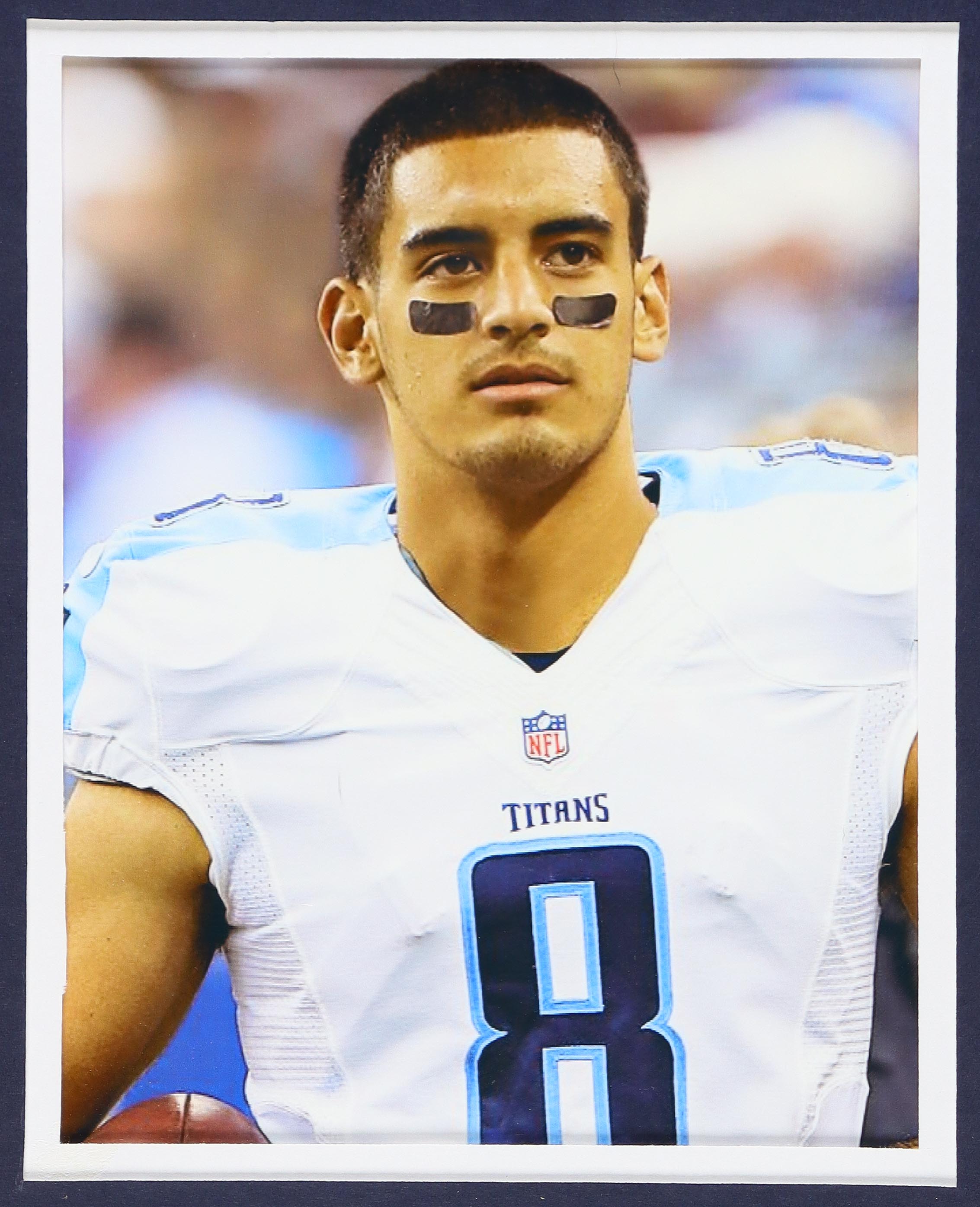 Custom frame measures 34" x 42" in size and features a Nike jersey that has been hand-signed by Marcus Mariota.