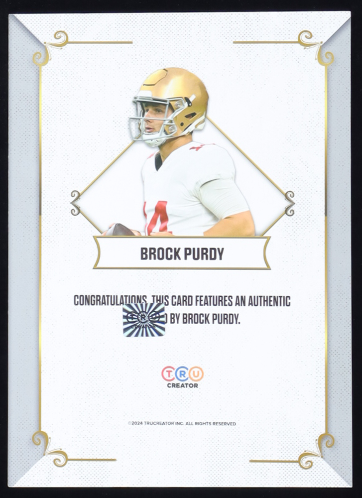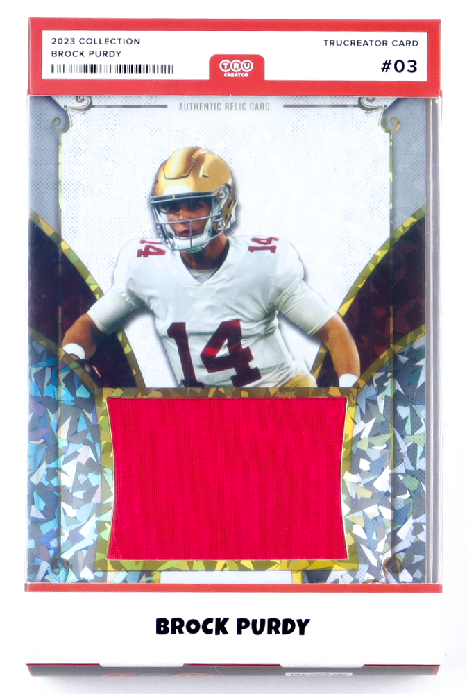 This auction is for a 2023 Brock Purdy Jumbo 5x7 TruSport Relic Rookie Card. This card contains a jumbo relic swatch. The card can be displayed similarly to other figurine-like products. The TruSport Brock Purdy Jumbo Relic Rookie Card is extremely limited and the print run is less than 500 cards in existence. This is the 1st Ever Print Edition for the Brock Purdy 2023 TruSport Jumbo Relic Rookie Card.