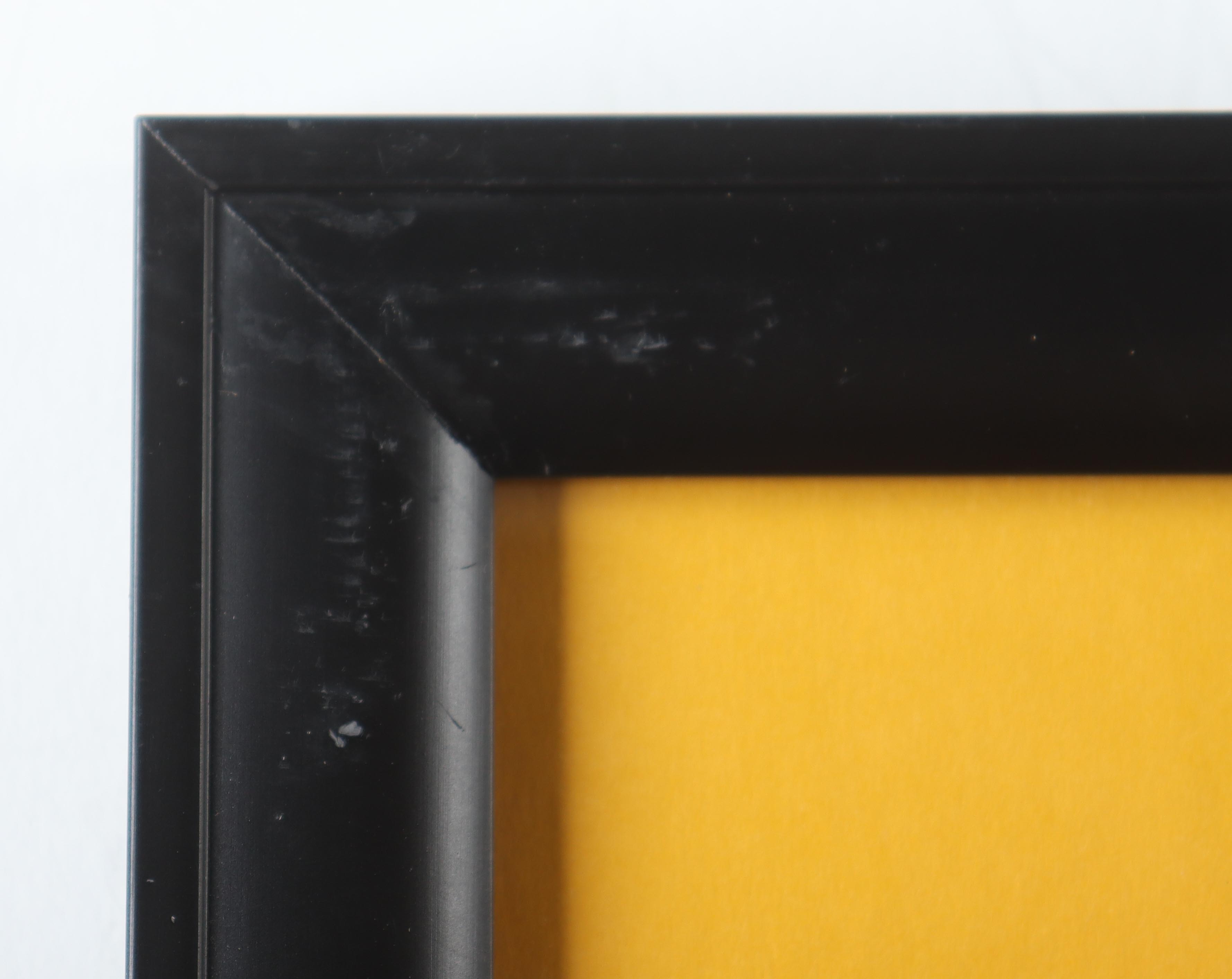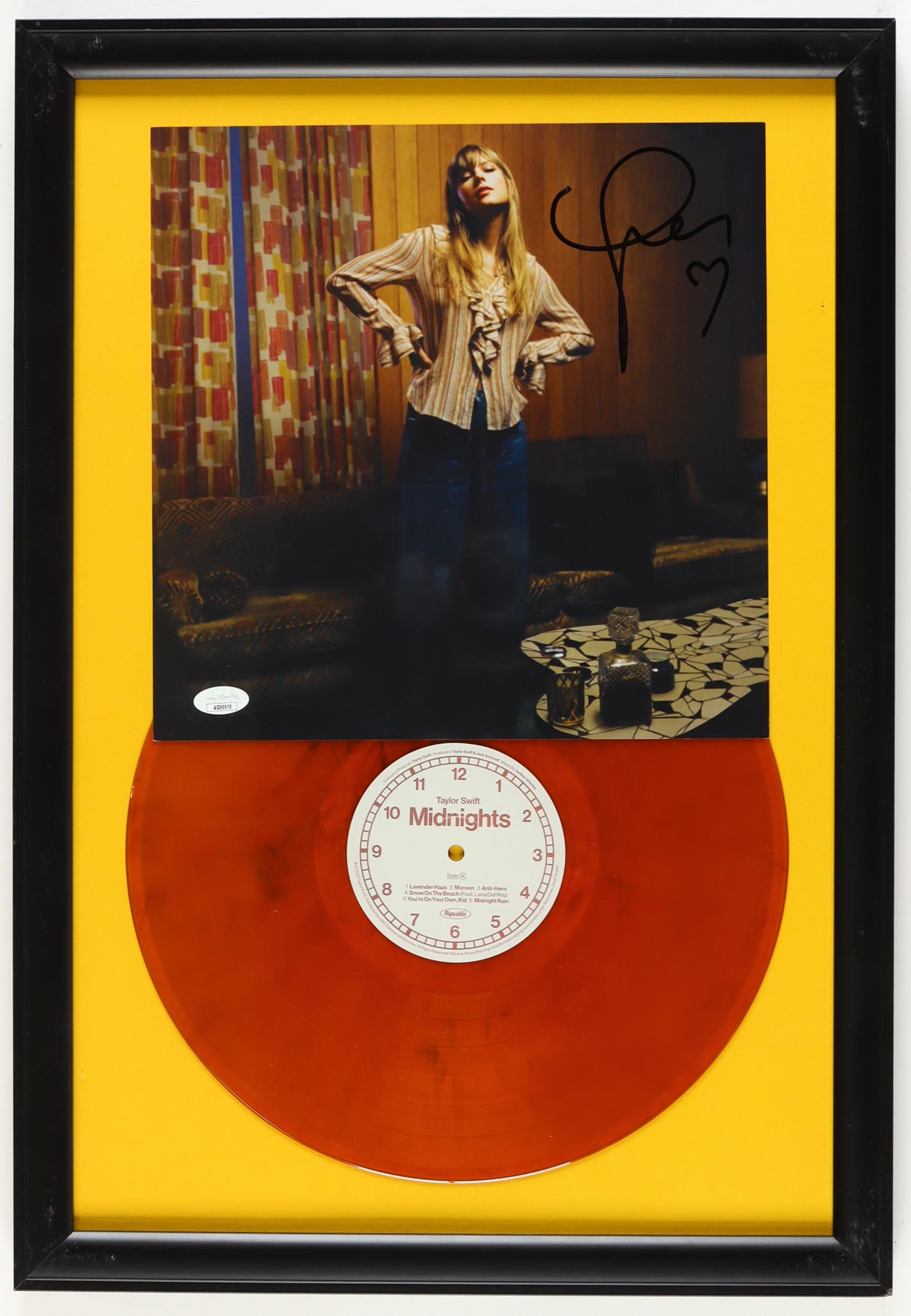 Custom frame measures approximately 16" x 23" in size. Features a "Midnights" record album insert that has been hand-signed by Taylor Swift. The display also includes a vinyl record. Please note, the frame shows signs of minor scuffing near the top corners of the frame.