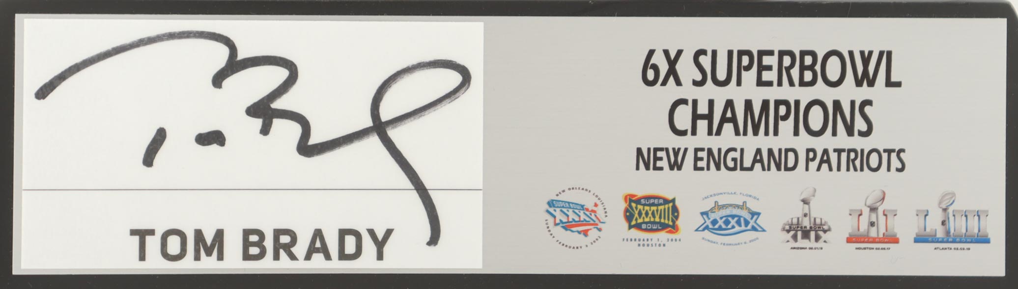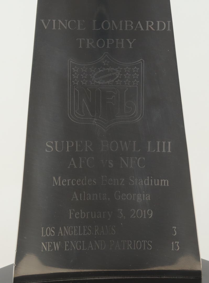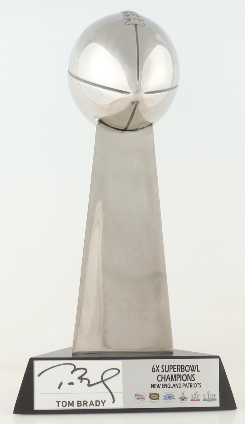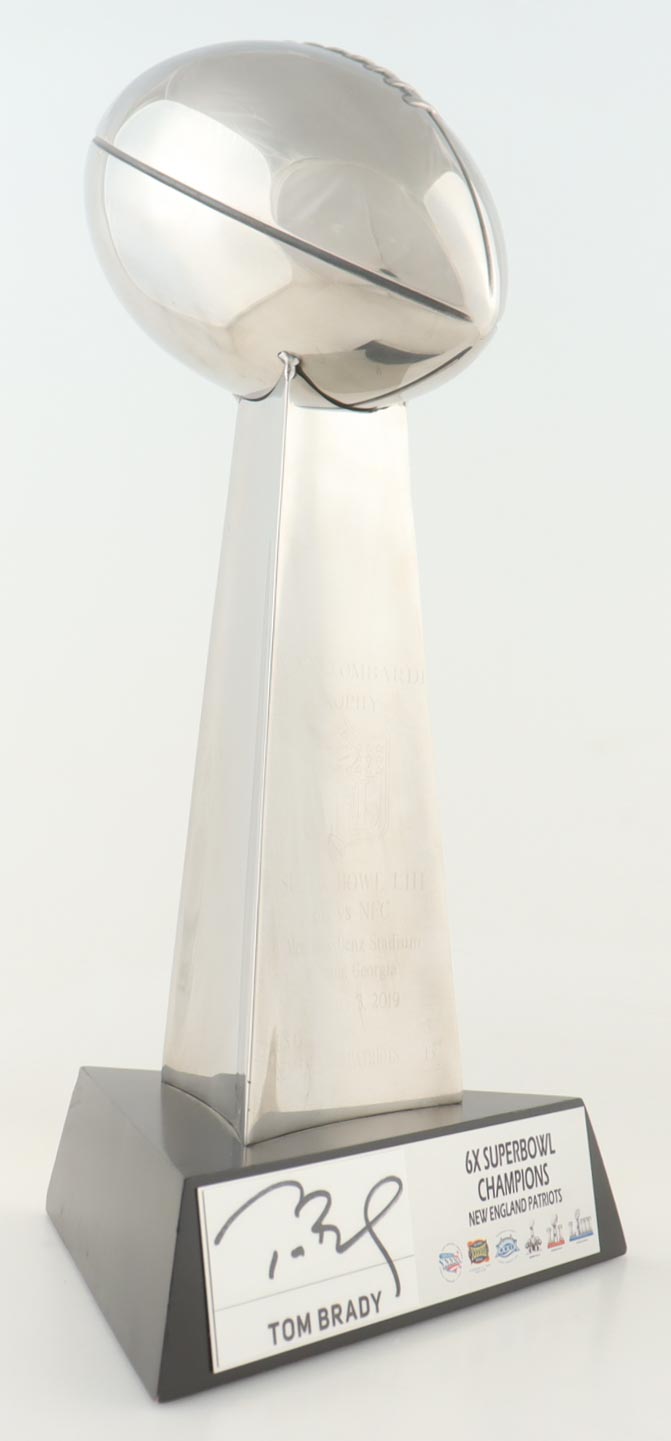 Premium Replica Super Bowl LIII Lombardi Trophy measures approximately 17" in height and features a hand-signed base by Patriots legend, Tom Brady!