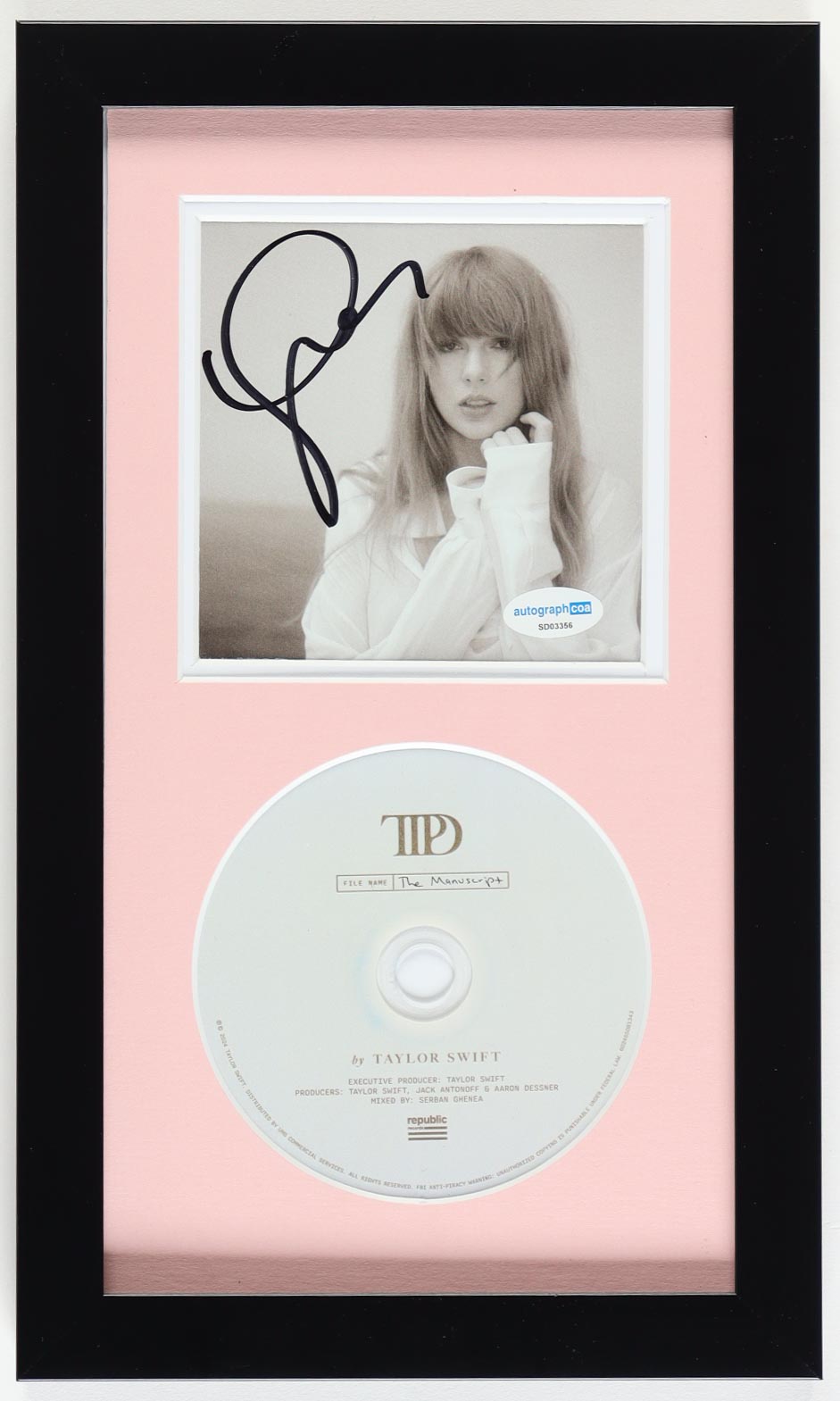 Custom frame measures approximately 8" x 13.5" in size. Features a "The Tortured Poets Department" CD album insert that has been hand-signed by Taylor Swift. The CD disc is included as shown.