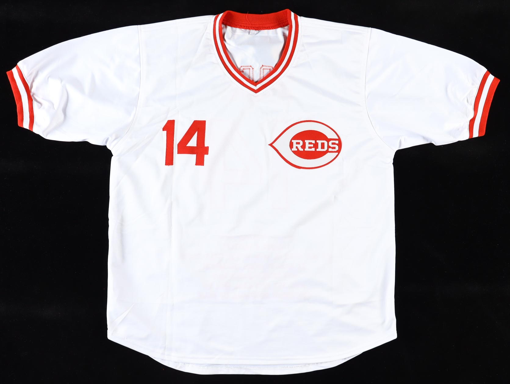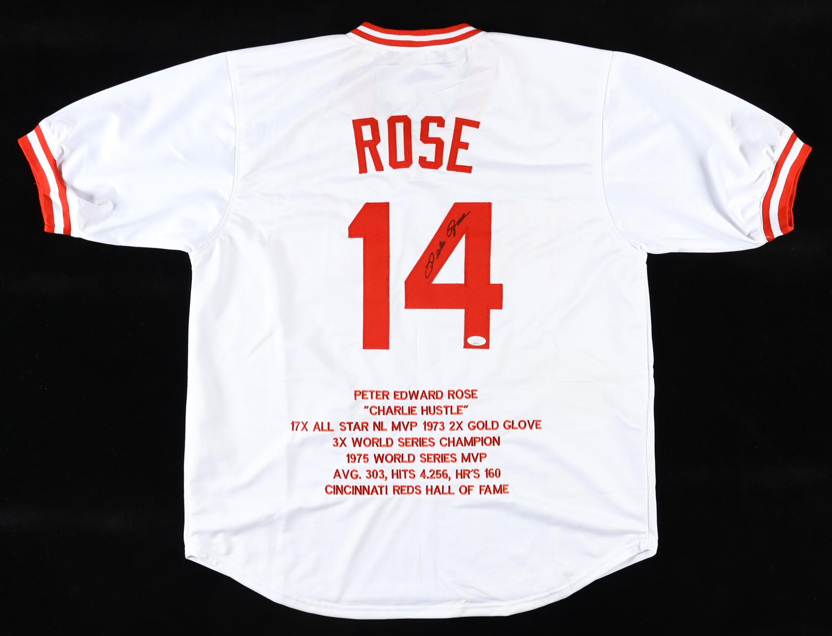 Custom jersey. Everything is sewn on, size XL. Hand-signed by Pete Rose (Cincinnati Reds). Rose's career highlights have been custom stitched onto the back of the jersey below the reverse numbers.