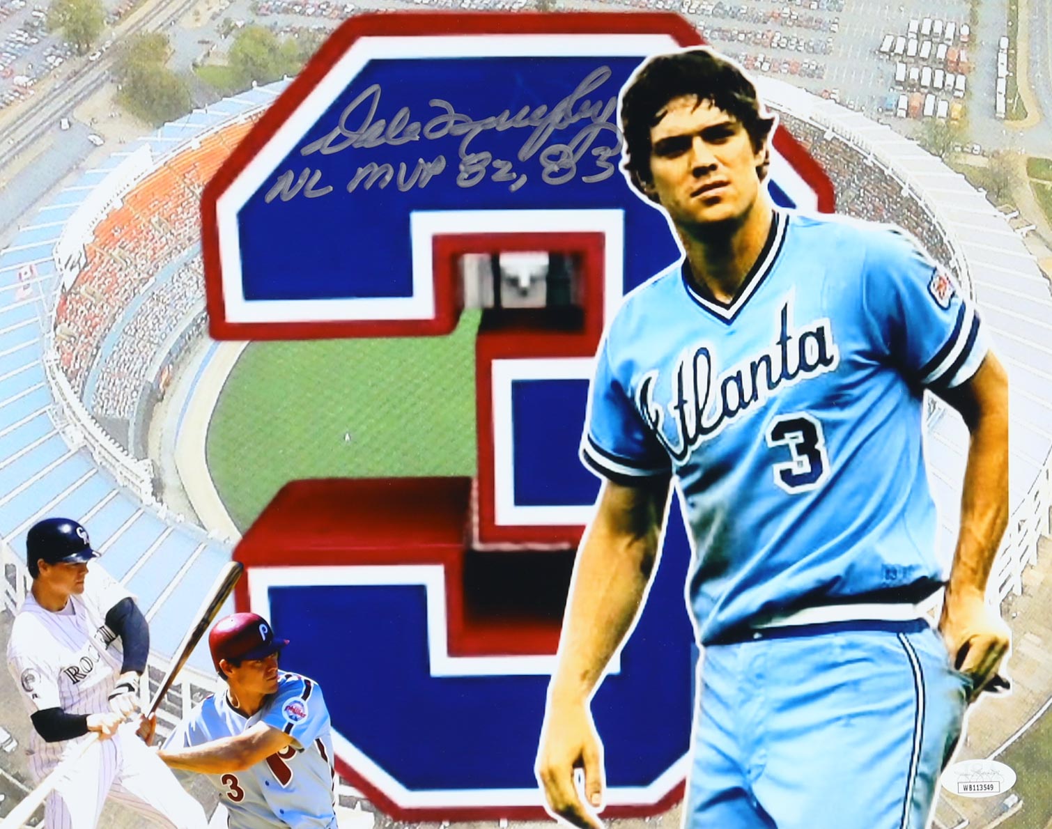 Photo measures 11" x 14" in size and has been hand-signed and inscribed by Dale Murphy (Atlanta Braves).