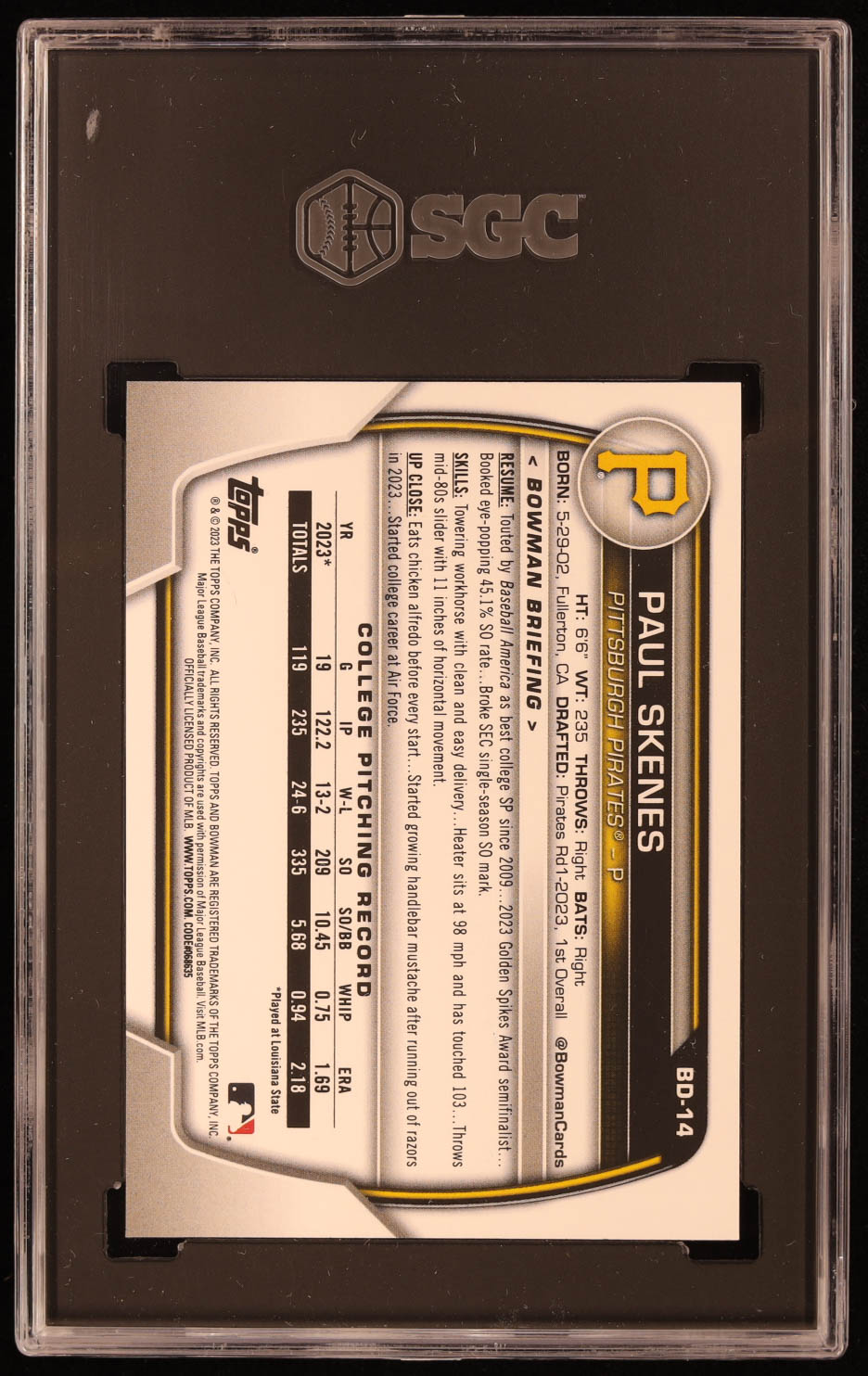 Paul Skenes 2023 Bowman Draft #BD14 RC (SGC 9.5)