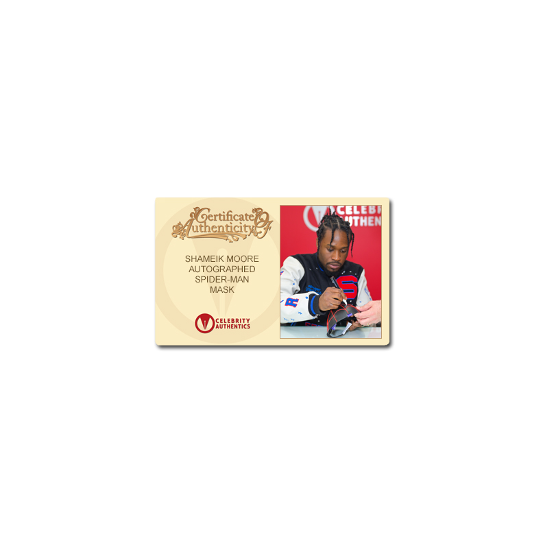 Ships affixed with Celebrity Authentics serial-numbered and tamper evident Authentication Hologram and includes Celebrity Authentics Certificate of Authenticity featuring picture of Shameik signing mask. Stock image used for product images. Item ships with clean, unsmudged autograph in similar location.
