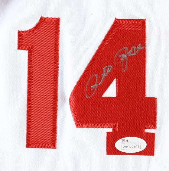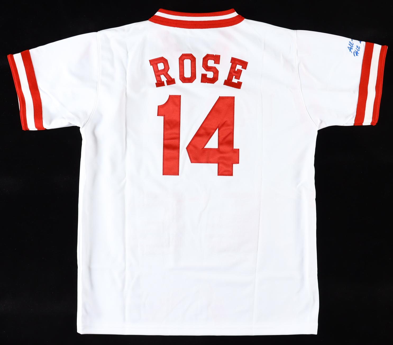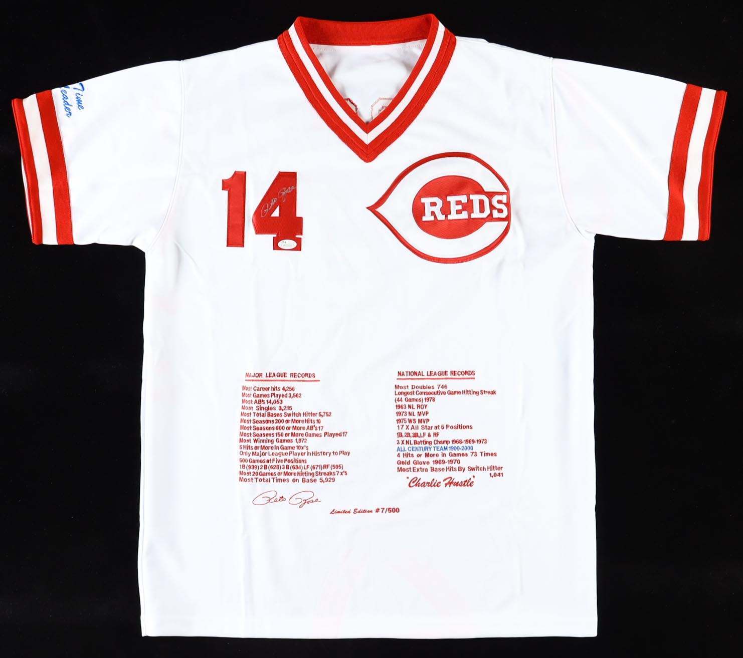 Custom jersey. Everything is sewn on, size XL. Hand-signed by Pete Rose. Rose's career highlights have been custom stitched onto the back of the jersey below the reverse numbers.