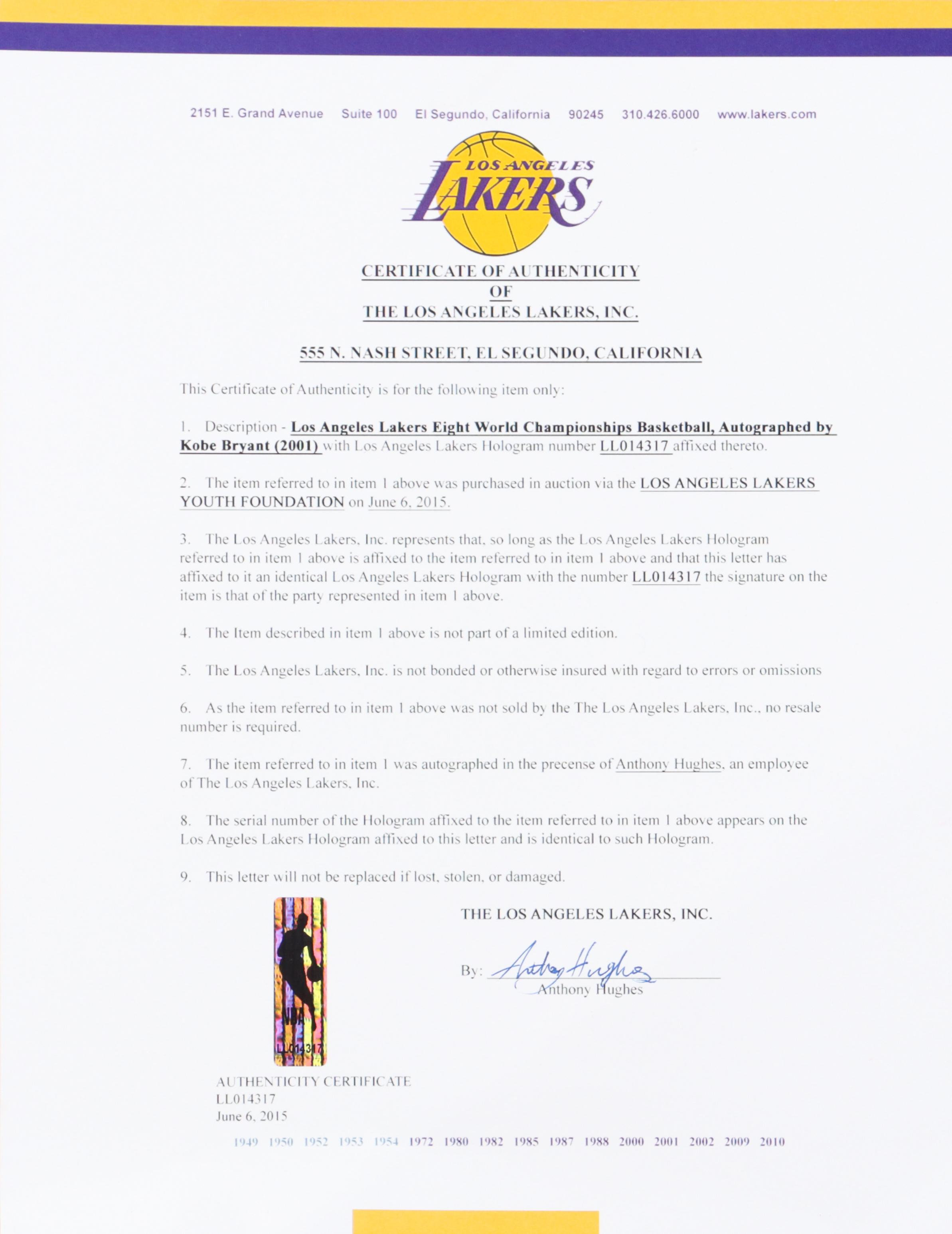 Los Angeles Lakers "Eight World Championships" logo basketball has been hand-signed by Lakers icon, Kobe Bryant!