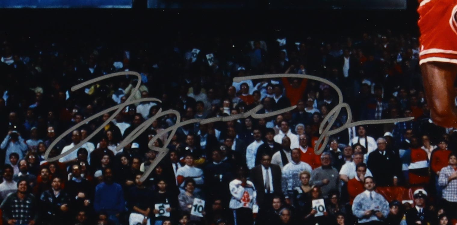 Custom frame measures approximately 12" x 14" in size and features a photo that has been hand-signed by Bulls great, Michael Jordan!