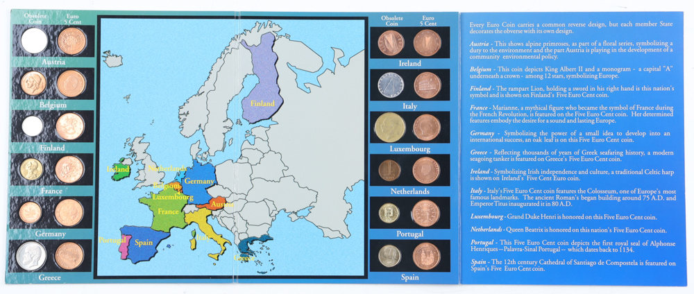 Set includes all (24) coins. One coin is an obsolete coin made before the European Monetary Union in 2002, and the other is a Euro coin made by each of the (11) countries highlighted, each unique. Please refer to photos for more details.