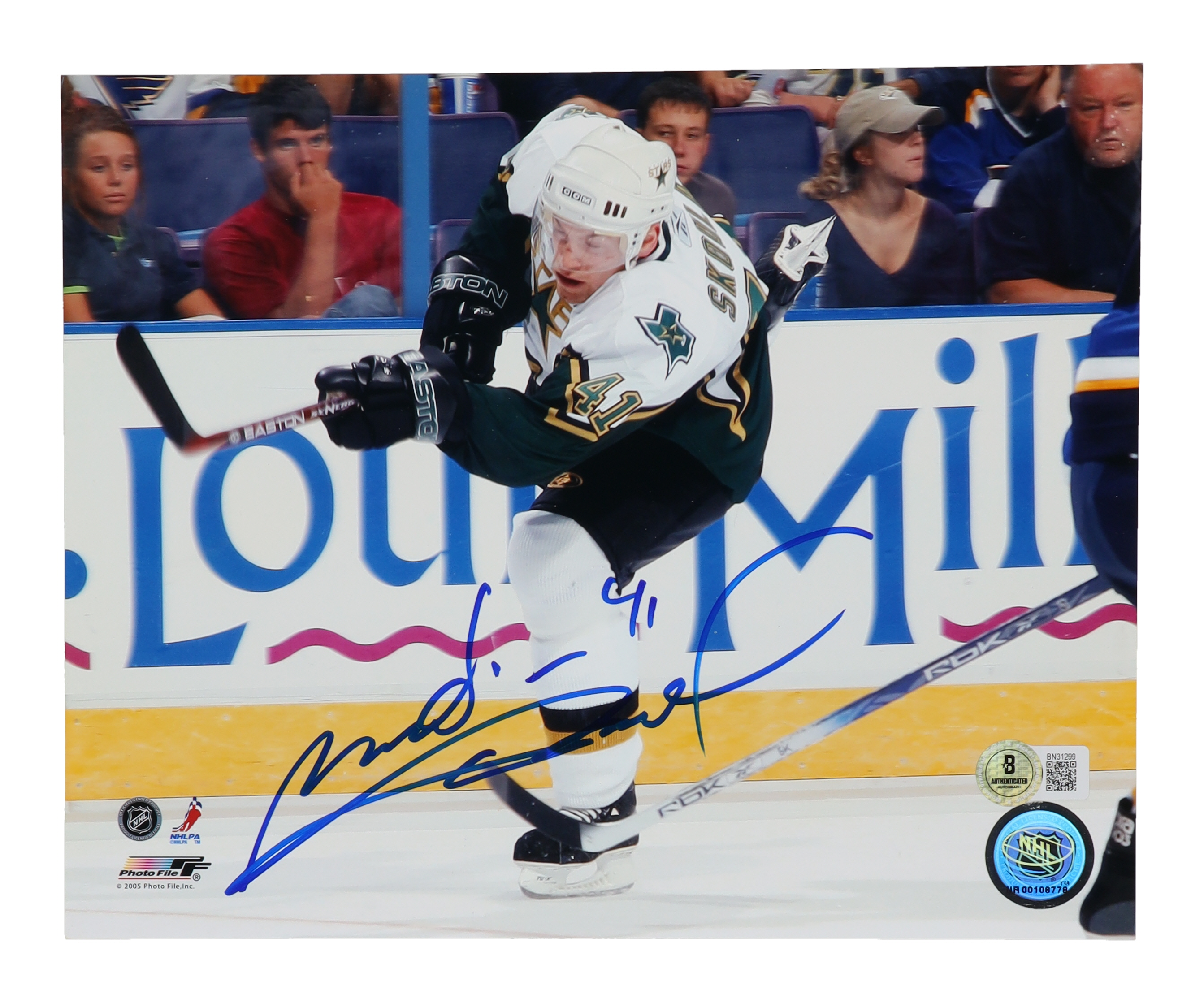 Photo measures 8" x 10" in size. Hand-signed by Martin Skoula (Dallas Stars).