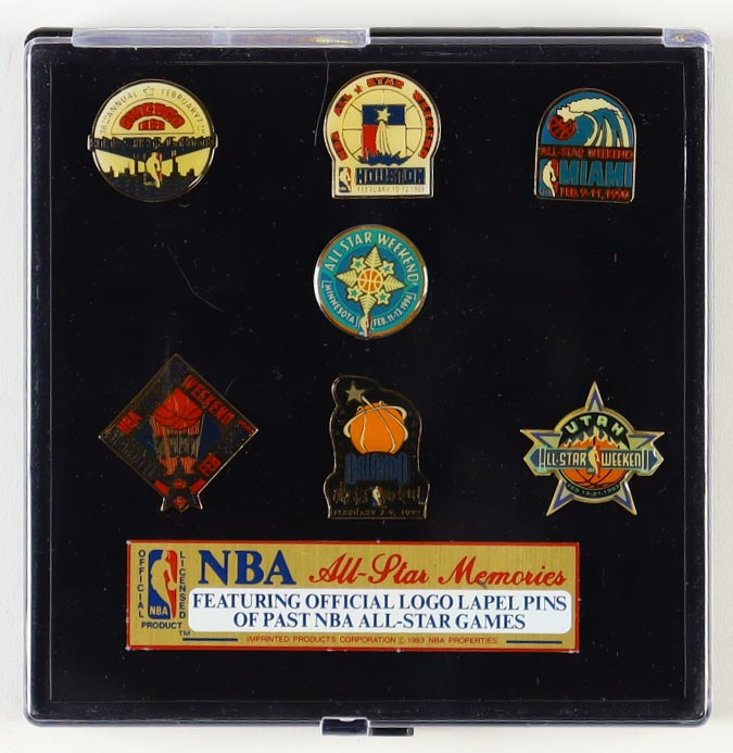 NBA "All-Star Memories" Official All-Star Games Logo (7) Pin Set. Features pins from 1988 Chicago,1989 Houston, 1990 Miami, 1991 Charlotte, 1992 Orlando and 1993 Utah. Please note, the pin set is unsigned.