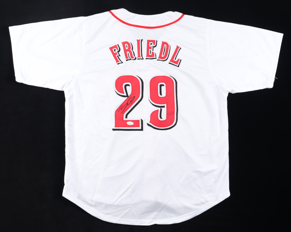 Custom jersey. Everything sewn on, size XL. Hand-signed by TJ Friedl.