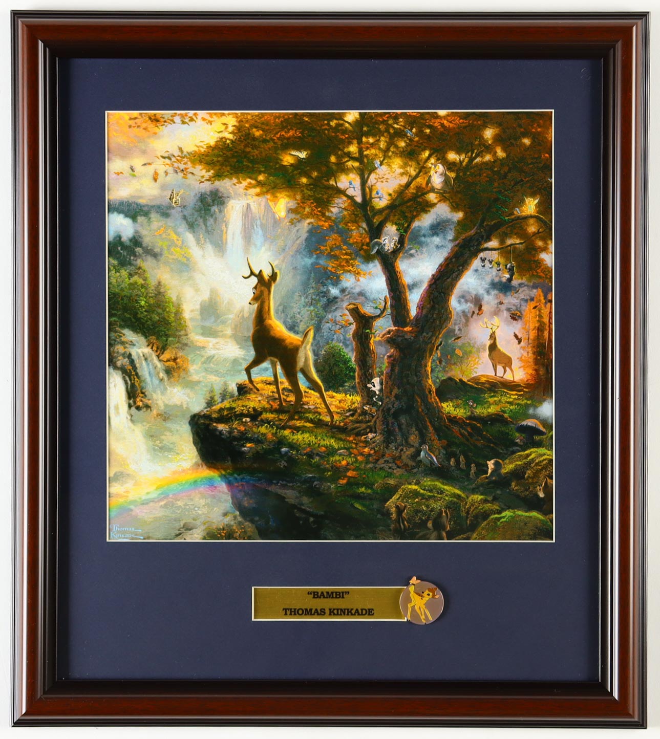 Custom frame measures approximately 16.25" x 18.25" in size and features a print of "Bambi" by Thomas Kinkade (D. 2012). Display also features a Bambi movie character pin. Please note, the display is unsigned.
