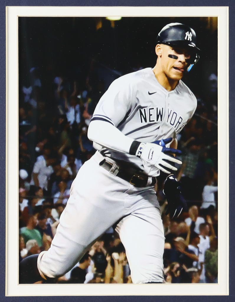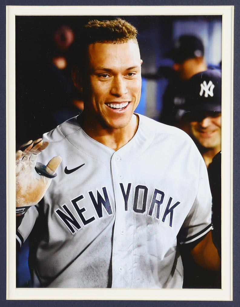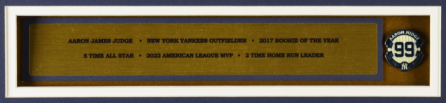 Custom frame measures approximately 32” x 36” in size and features a custom unsigned Aaron Judge jersey. The display also includes a player number pin and (2) cloth team patches. Please note, the display is unsigned.