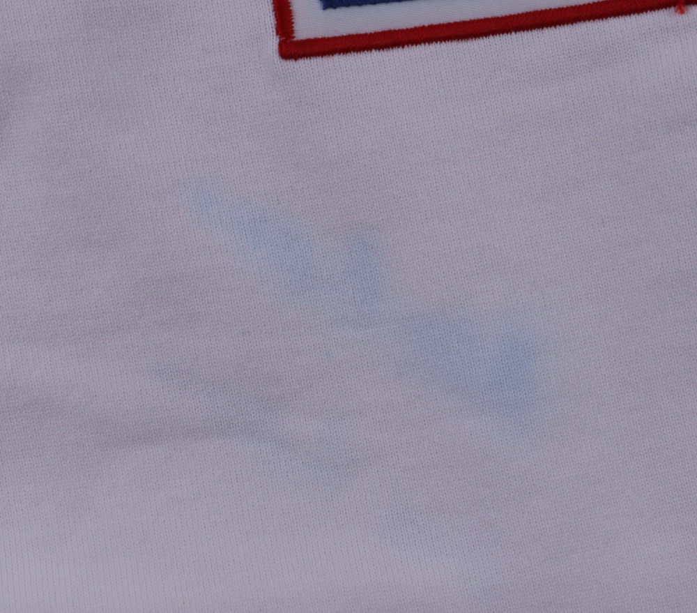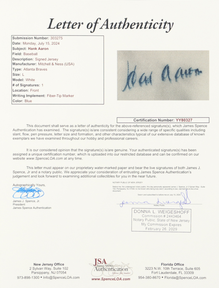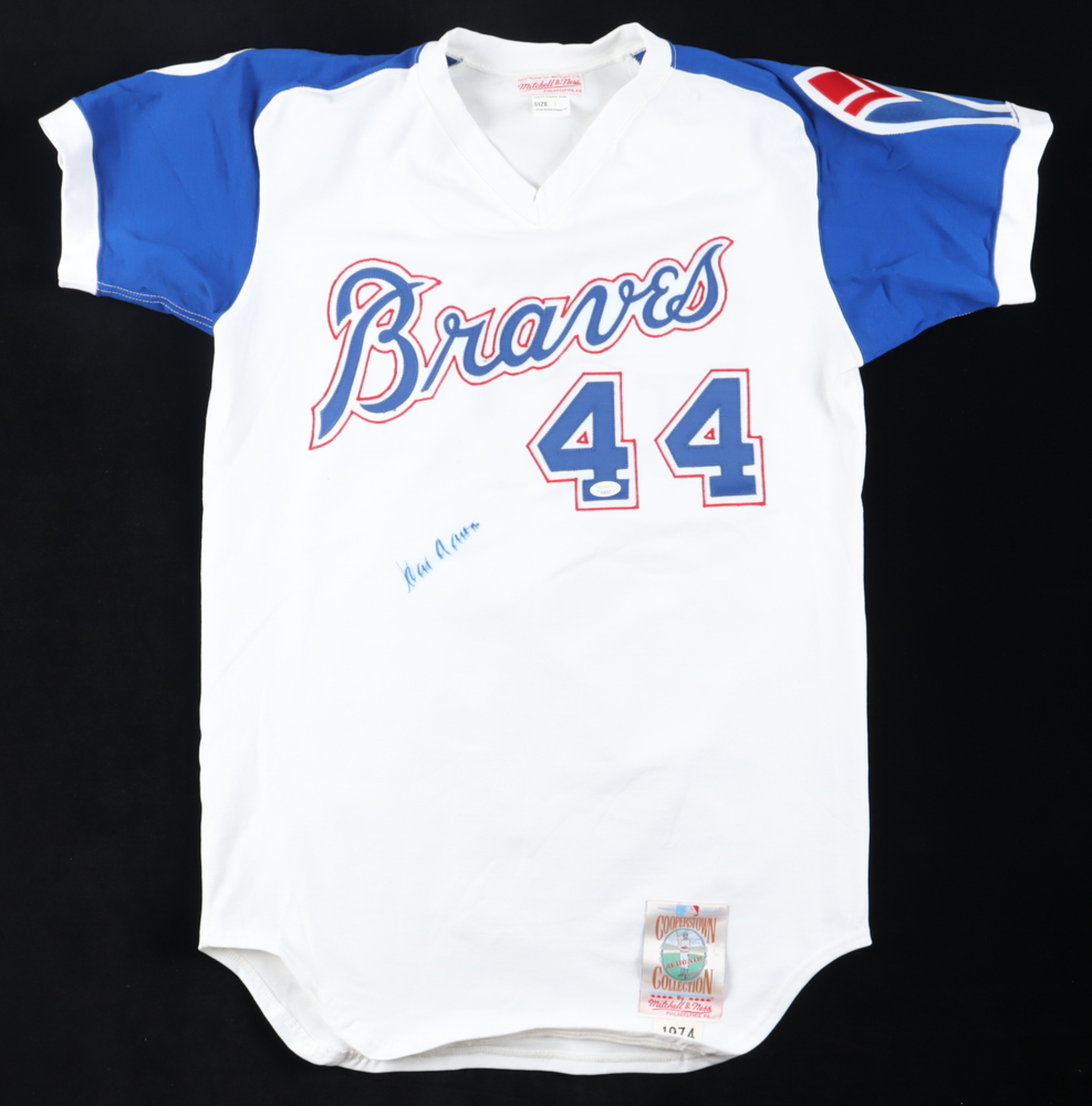 Mitchell & Ness jersey with everything is sewn on, size L. Hand-signed by Hank Aaron (D. 2021, HOF). Please note, there is staining on the front and back of the jersey. Also, the signature has bled. See photos regarding the condition of the item.