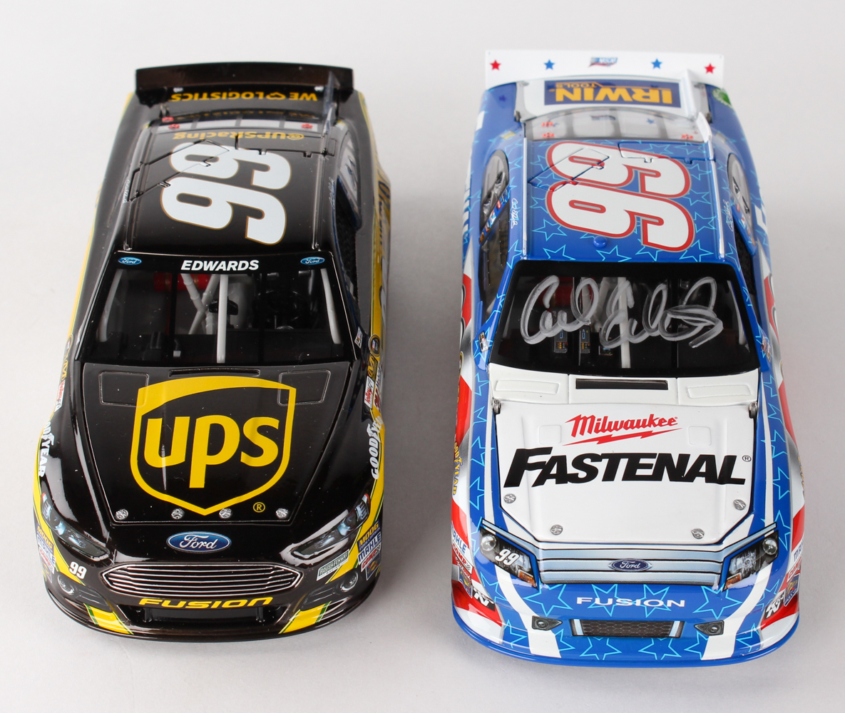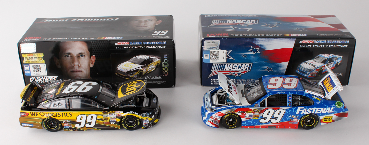 Lot comes with all (2) cars shown. NASCAR 1:24 Scale Die Cast Car. One car has been hand-signed in silver paint pen by Carl Edwards. Please note only (1) car is signed. The cars also come in their original packaging.