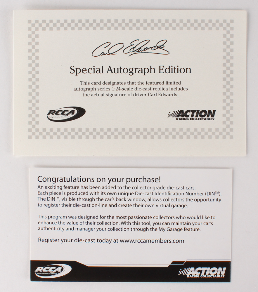 The lot / autograph(s) includes an official Carl Edwards player COA for authenticity purposes.