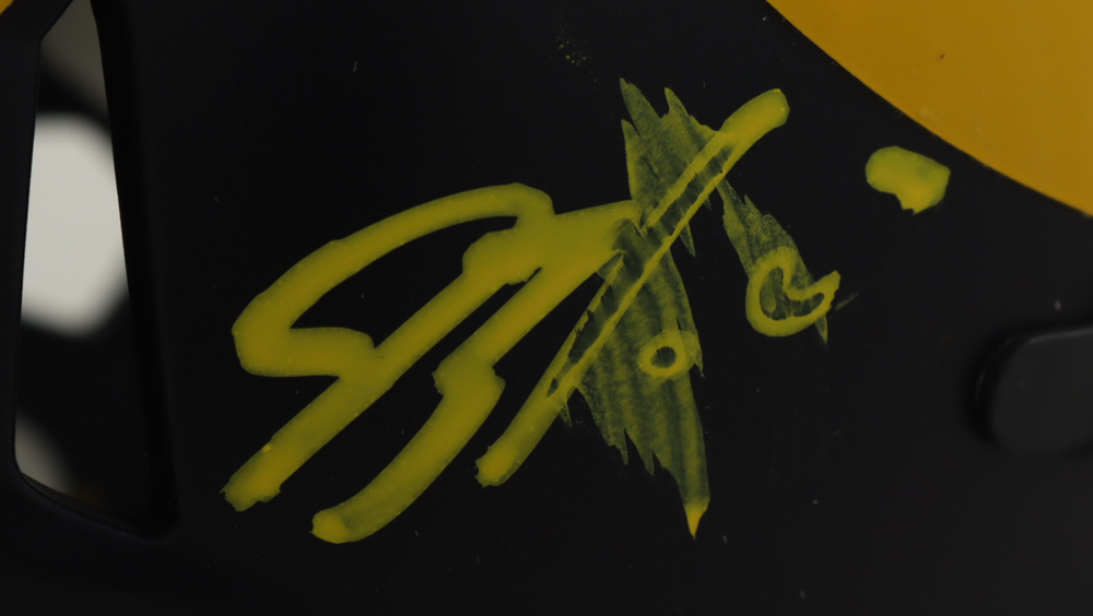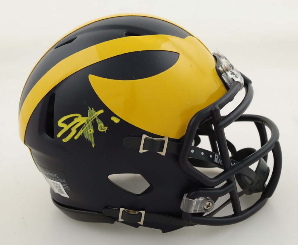 Riddell Michigan Wolverines speed mini helmet has been hand-signed by Blake Corum. Please note, the autograph is smudged.