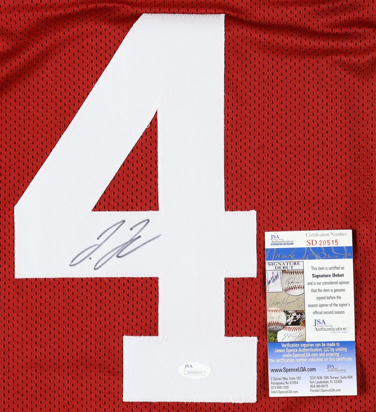 The autograph(s) includes an official James Spence Authentication (JSA) "Signature Debut" hologram and COA. "Signature Debut" is the autographed memorabilia equivalent to a rookie card. The JSA definition of a "Signature Debut" is as follows: "Any item that is autographed and received by JSA prior to the last game of the signer's official rookie season.